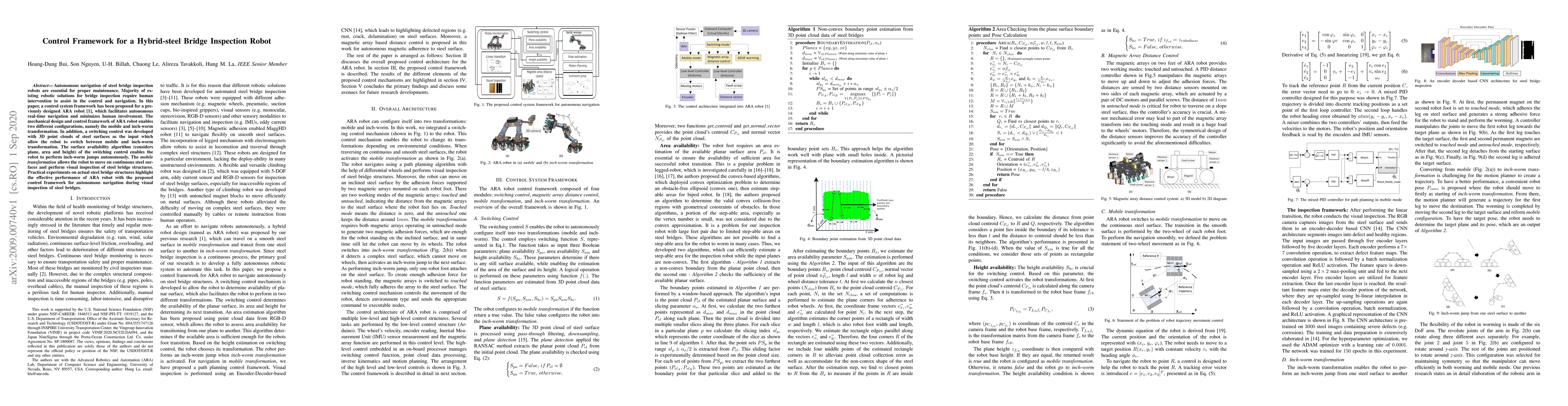 Autonomous navigation of steel bridge inspection robots is essential for proper maintenance. The majority of existing robotic solutions for bridge inspection require human intervention to assist in the control and navigation. In this paper, a control system framework has been proposed for a previously designed ARA robot [1], which facilitates autonomous real-time navigation and minimizes human involvement. The mechanical design and control framework of ARA robot enables two different configurations, namely the mobile and inch-worm transformation. In addition, a switching control was developed with 3D point clouds of steel surfaces as the input which allows the robot to switch between mobile and inch-worm transformation. The surface availability algorithm (considers plane, area, and height) of the switching control enables the robot to perform inch-worm jumps autonomously. Themobiletransformationallows the robot to move on continuous steel surfaces and perform visual inspection of steel bridge structures. Practical experiments on actual steel bridge structures highlight the effective performance of ARA robot with the proposed control framework for autonomous navigation during a visual inspection of steel bridges.