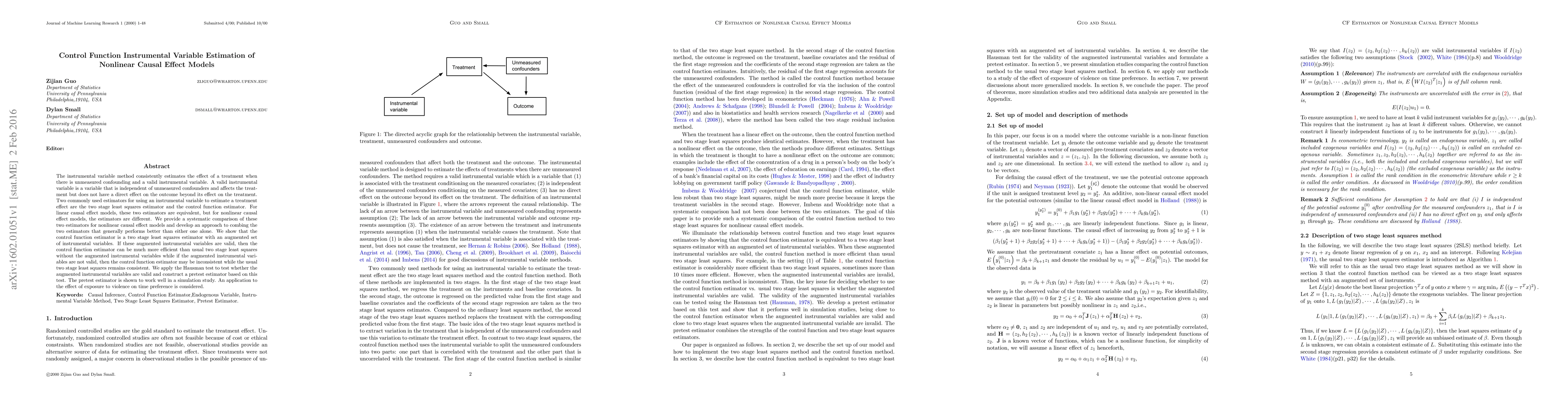 The instrumental variable method consistently estimates the effect of a treatment when there is unmeasured confounding and a valid instrumental variable. A valid instrumental variable is a variable that is independent of unmeasured confounders and affects the treatment but does not have a direct effect on the outcome beyond its effect on the treatment. Two commonly used estimators for using an instrumental variable to estimate a treatment effect are the two stage least squares estimator and the control function estimator. For linear causal effect models, these two estimators are equivalent, but for nonlinear causal effect models, the estimators are different. We provide a systematic comparison of these two estimators for nonlinear causal effect models and develop an approach to combing the two estimators that generally performs better than either one alone. We show that the control function estimator is a two stage least squares estimator with an augmented set of instrumental variables. If these augmented instrumental variables are valid, then the control function estimator can be much more efficient than usual two stage least squares without the augmented instrumental variables while if the augmented instrumental variables are not valid, then the control function estimator may be inconsistent while the usual two stage least squares remains consistent. We apply the Hausman test to test whether the augmented instrumental variables are valid and construct a pretest estimator based on this test. The pretest estimator is shown to work well in a simulation study. An application to the effect of exposure to violence on time preference is considered.