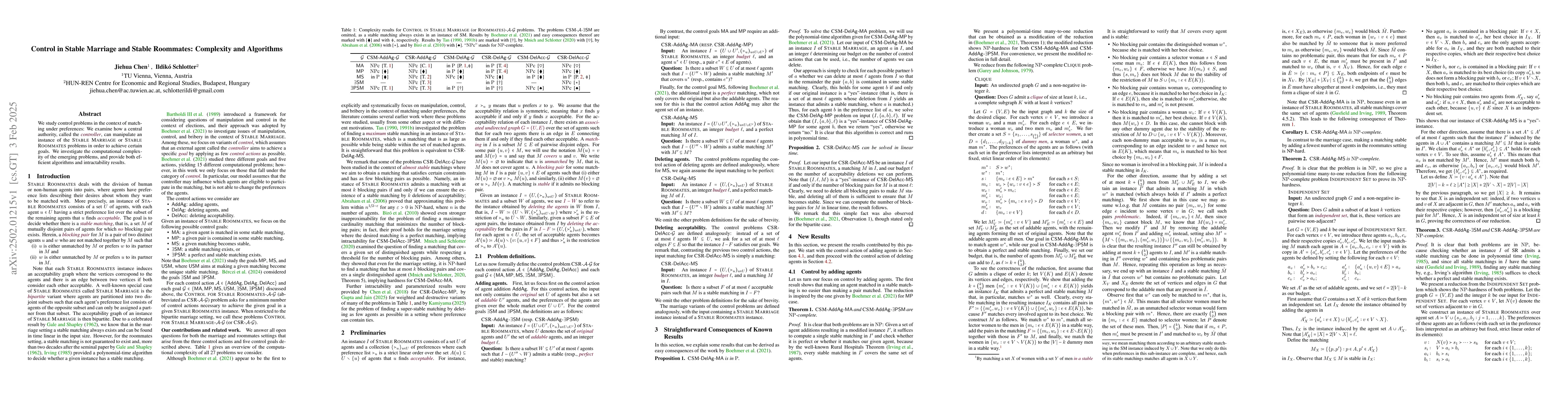 The paper presents both efficient algorithms and intractability proofs for control problems in Stable Marriage and Stable Roommates instances.