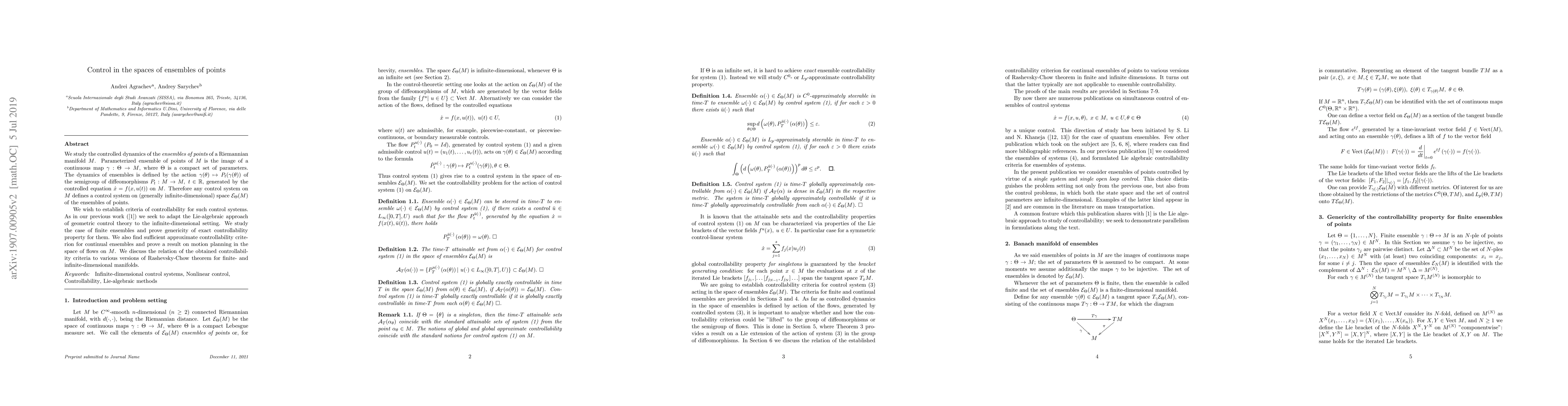 We study the controlled dynamics of the {\it ensembles of points} of a Riemannian manifold $M$. Parameterized ensemble of points of $M$ is the image of a continuous map $\gamma:\Theta \to M$, where $\Theta$ is a compact set of parameters. The dynamics of ensembles is defined by the action $\gamma(\theta) \mapsto P_t(\gamma(\theta))$ of the semigroup of diffeomorphisms $P_t:M \to M, \ t \in \mathbb{R}$, generated by the controlled equation $\dot{x}=f(x,u(t))$ on $M$. Therefore any control system on $M$ defines a control system on (generally infinite-dimensional) space $\mathcal{E}_\Theta(M)$ of the ensembles of points. We wish to establish criteria of controllability for such control systems. As in our previous work ([1]) we seek to adapt the Lie-algebraic approach of geometric control theory to the infinite-dimensional setting. We study the case of finite ensembles and prove genericity of exact controllability property for them. We also find sufficient approximate controllability criterion for continual ensembles and prove a result on motion planning in the space of flows on $M$. We discuss the relation of the obtained controllability criteria to various versions of Rashevsky-Chow theorem for finite- and infinite-dimensional manifolds.