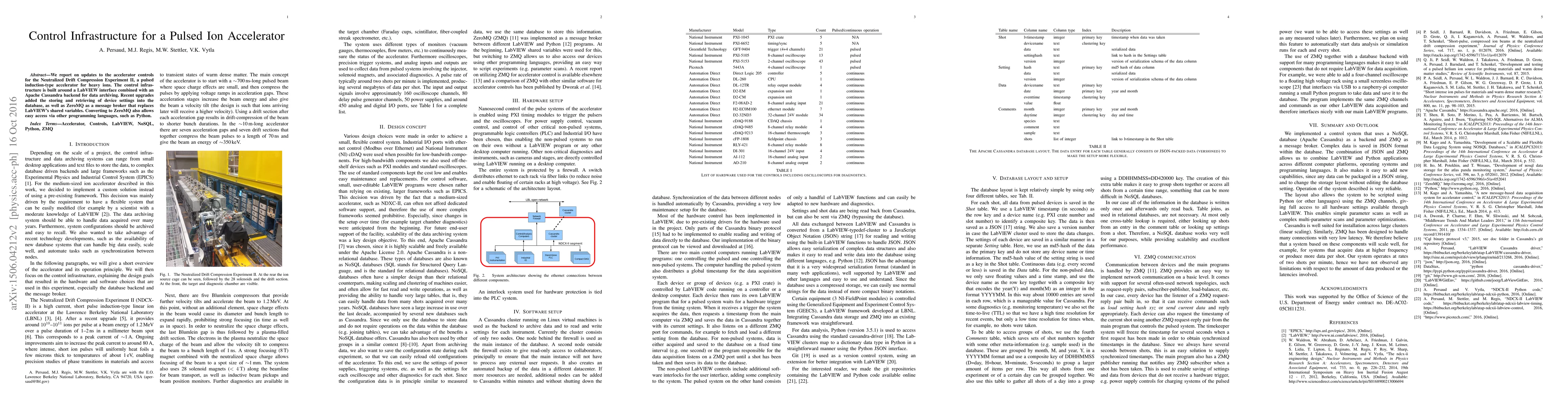 Summary: This paper details enhancements to the control system for a pulsed ion accelerator, incorporating a LabVIEW interface and an Apache Cassandra backend, with recent upgrades including device settings storage and a ZeroMQ message broker for improved accessibility in various programming languages.