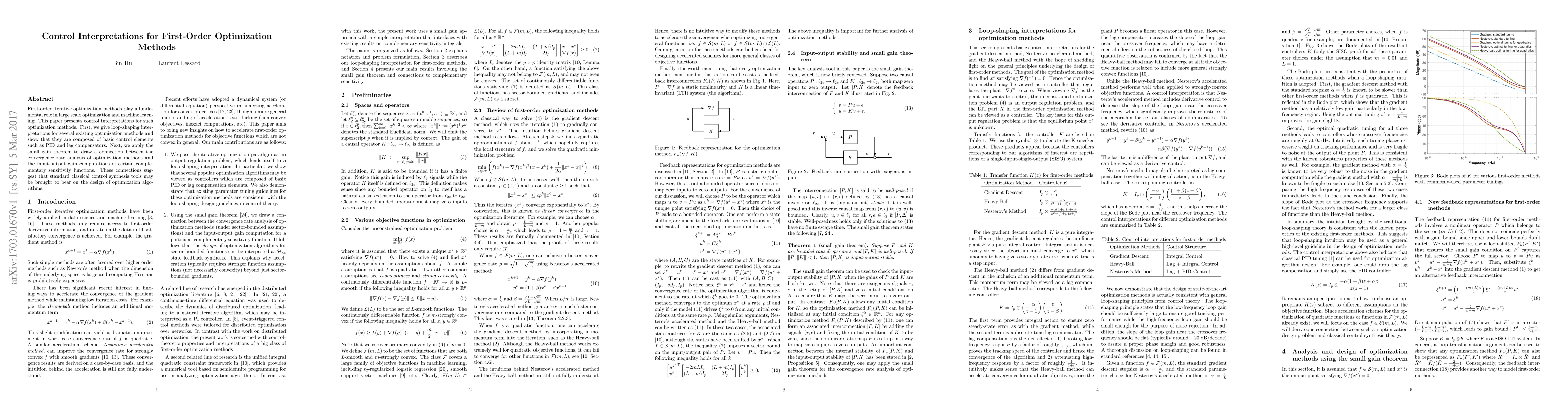 This paper explores control interpretations of first-order optimization methods, revealing their composition of basic control elements like PID and lag compensators. It uses the small gain theorem to link convergence rate analysis of optimization methods with input-output gain computations, suggesting the application of classical control synthesis tools in optimization algorithm design.