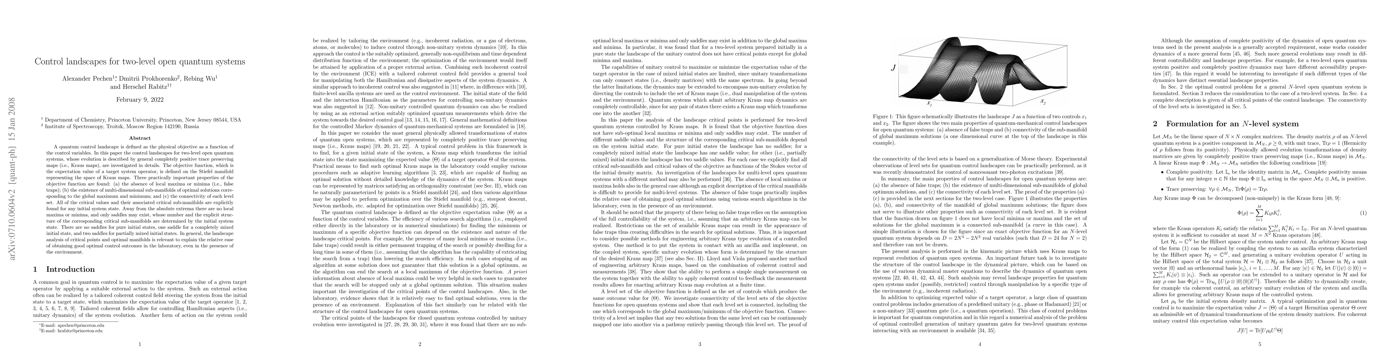 A quantum control landscape is defined as the physical objective as a function of the control variables. In this paper the control landscapes for two-level open quantum systems, whose evolution is described by general completely positive trace preserving maps (i.e., Kraus maps), are investigated in details. The objective function, which is the expectation value of a target system operator, is defined on the Stiefel manifold representing the space of Kraus maps. Three practically important properties of the objective function are found: (a) the absence of local maxima or minima (i.e., false traps); (b) the existence of multi-dimensional sub-manifolds of optimal solutions corresponding to the global maximum and minimum; and (c) the connectivity of each level set. All of the critical values and their associated critical sub-manifolds are explicitly found for any initial system state. Away from the absolute extrema there are no local maxima or minima, and only saddles may exist, whose number and the explicit structure of the corresponding critical sub-manifolds are determined by the initial system state. There are no saddles for pure initial states, one saddle for a completely mixed initial state, and two saddles for other initial states. In general, the landscape analysis of critical points and optimal manifolds is relevant to the problem of explaining the relative ease of obtaining good optimal control outcomes in the laboratory, even in the presence of the environment.