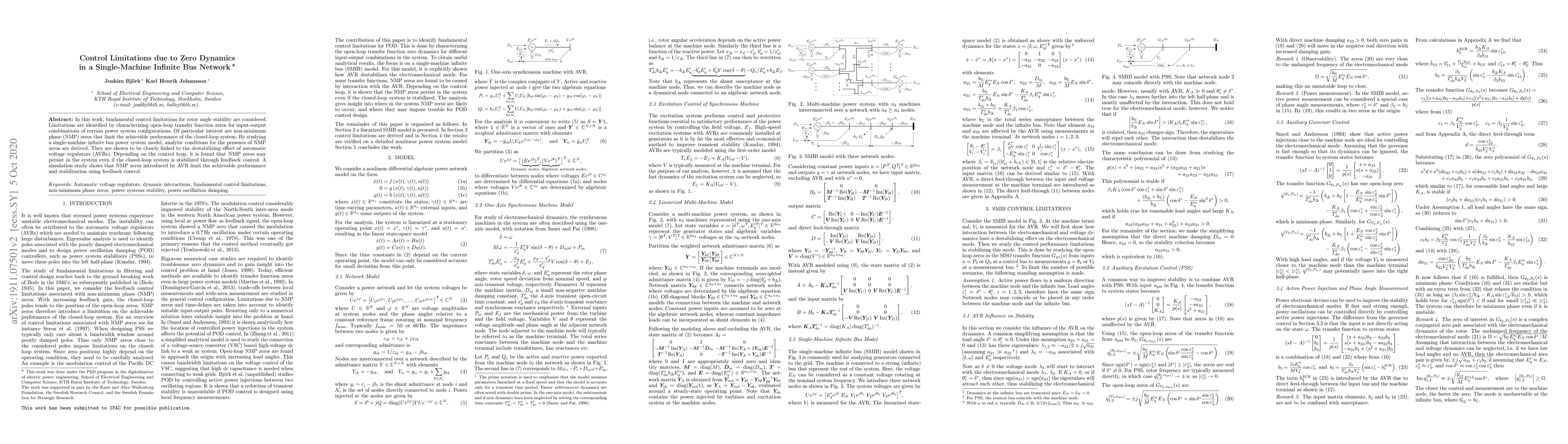 This paper investigates control limitations in rotor angle stability due to non-minimum phase (NMP) zeros in a single-machine infinite bus network. It derives analytic conditions for NMP zeros linked to automatic voltage regulators, showing that these zeros can persist and limit performance despite feedback stabilization.