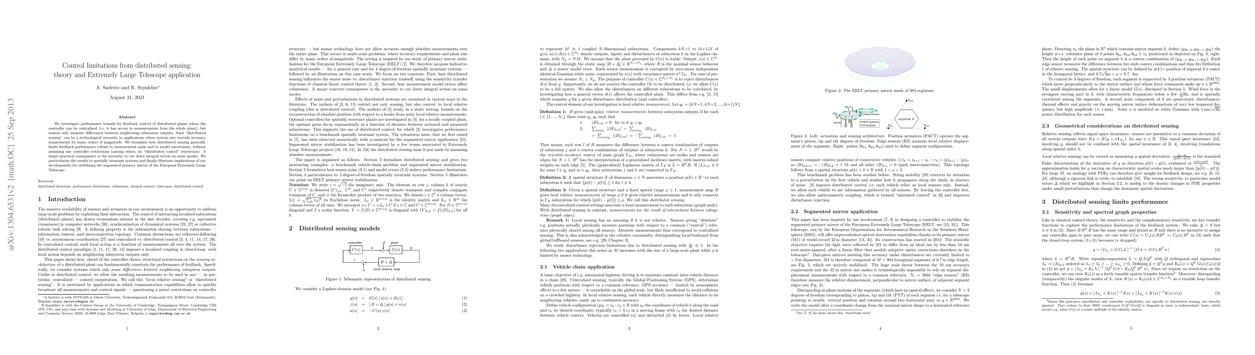 This paper explores the theoretical limits on feedback control in distributed systems where sensors only measure local differences, focusing on applications like large telescopes. It demonstrates that distributed sensing inherently limits robust performance, necessitating reduced integral action in some control modes, and applies these findings to the stabilization of the European Extremely Large Telescope's segmented mirror.