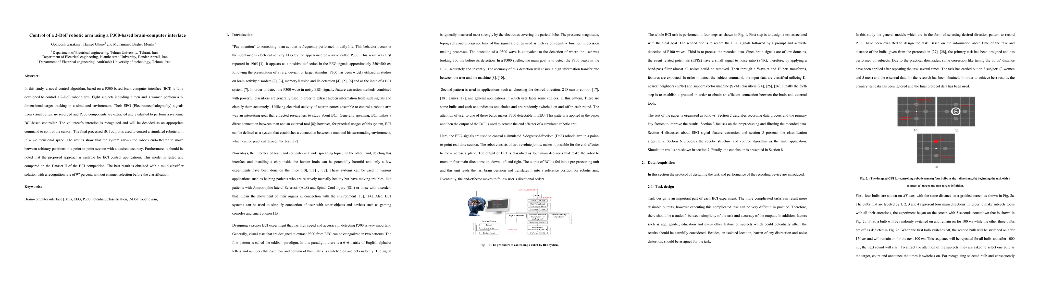 This study develops a P300-based brain-computer interface to control a 2-DoF robotic arm, achieving 97% recognition accuracy using multi-class SVM. The system enables subjects to navigate a cursor and control the robotic arm to write letters in a simulated environment.