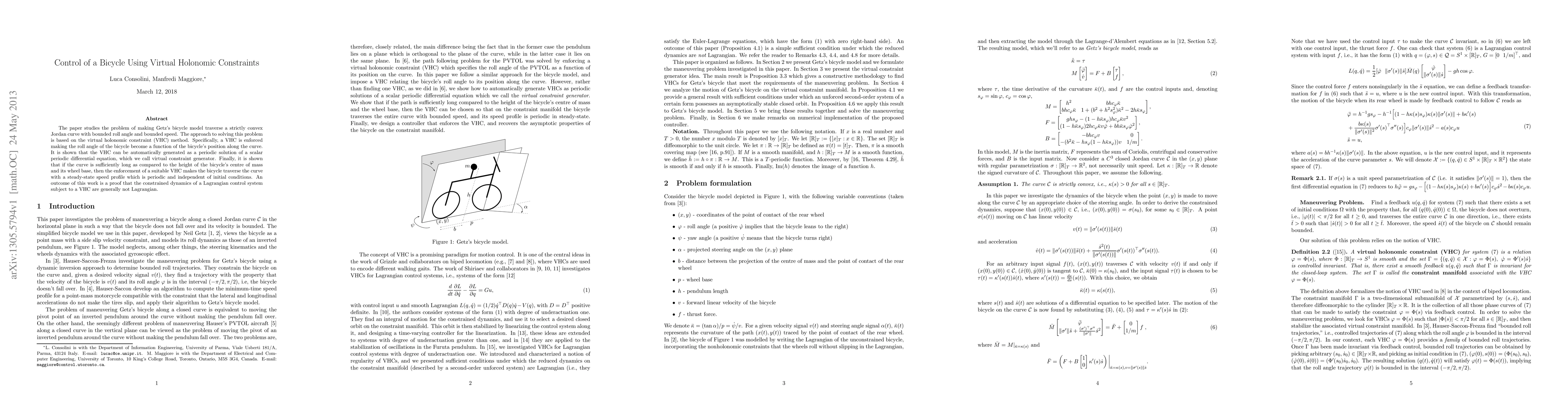 The paper studies the problem of making Getz's bicycle model traverse a strictly convex Jordan curve with bounded roll angle and bounded speed. The approach to solving this problem is based on the virtual holonomic constraint (VHC) method. Specifically, a VHC is enforced making the roll angle of the bicycle become a function of the bicycle's position along the curve. It is shown that the VHC can be automatically generated as a periodic solution of a scalar periodic differential equation, which we call virtual constraint generator. Finally, it is shown that if the curve is sufficiently long as compared to the height of the bicycle's centre of mass and its wheel base, then the enforcement of a suitable VHC makes the bicycle traverse the curve with a steady-state speed profile which is periodic and independent of initial conditions. An outcome of this work is a proof that the constrained dynamics of a Lagrangian control system subject to a VHC are generally not Lagrangian.