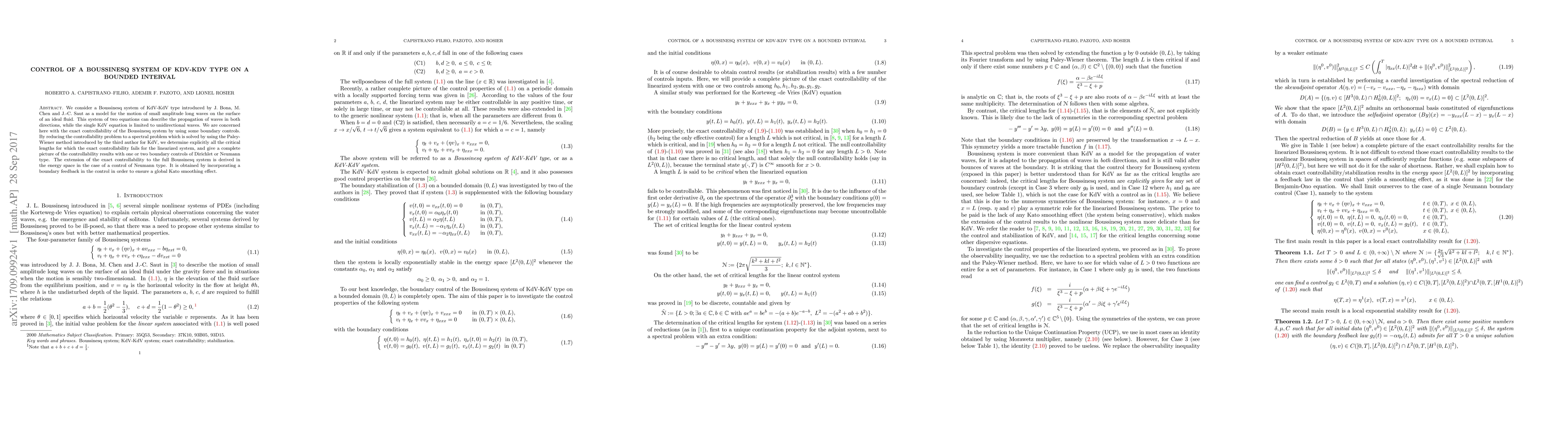 This paper investigates the exact controllability of a Boussinesq system modeling long wave motion, determining critical lengths for control failure and presenting controllability results for various boundary control types. The exact controllability of the full system is achieved via a boundary feedback incorporating a global Kato smoothing effect.