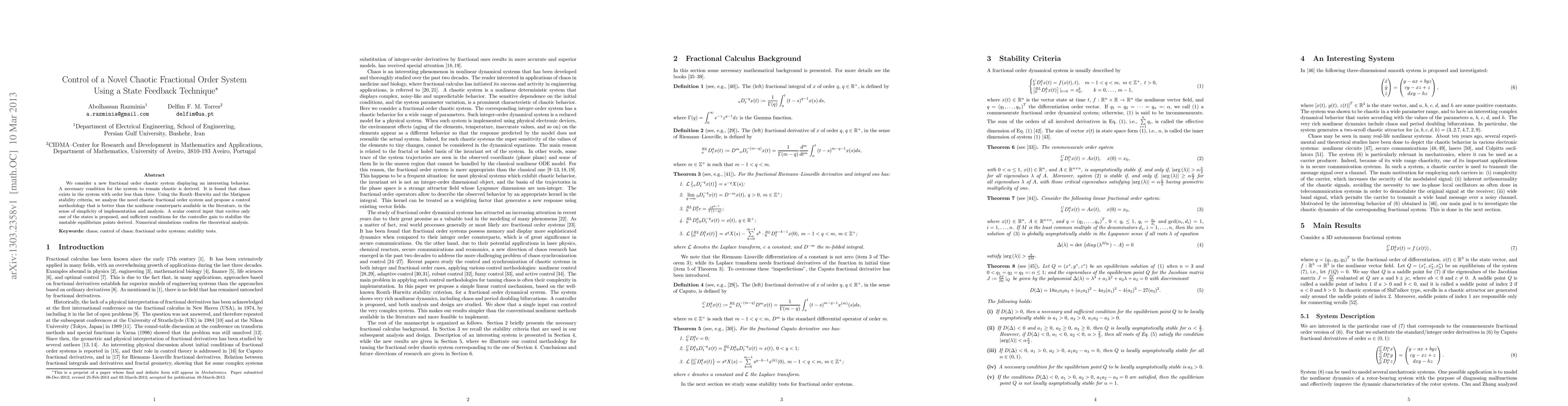 This paper investigates a novel chaotic fractional order system, deriving conditions for its chaotic behavior and proposing a state feedback control technique that simplifies stabilization compared to existing methods. Numerical simulations validate the effectiveness of the proposed control strategy.