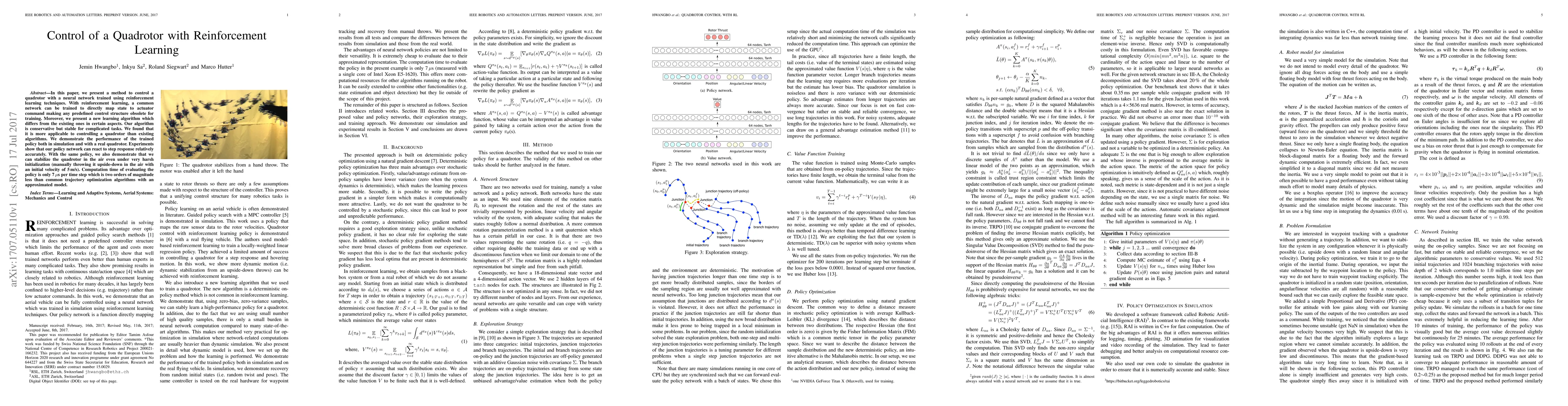 In this paper, we present a method to control a quadrotor with a neural network trained using reinforcement learning techniques. With reinforcement learning, a common network can be trained to directly map state to actuator command making any predefined control structure obsolete for training. Moreover, we present a new learning algorithm which differs from the existing ones in certain aspects. Our algorithm is conservative but stable for complicated tasks. We found that it is more applicable to controlling a quadrotor than existing algorithms. We demonstrate the performance of the trained policy both in simulation and with a real quadrotor. Experiments show that our policy network can react to step response relatively accurately. With the same policy, we also demonstrate that we can stabilize the quadrotor in the air even under very harsh initialization (manually throwing it upside-down in the air with an initial velocity of 5 m/s). Computation time of evaluating the policy is only 7 {\mu}s per time step which is two orders of magnitude less than common trajectory optimization algorithms with an approximated model.