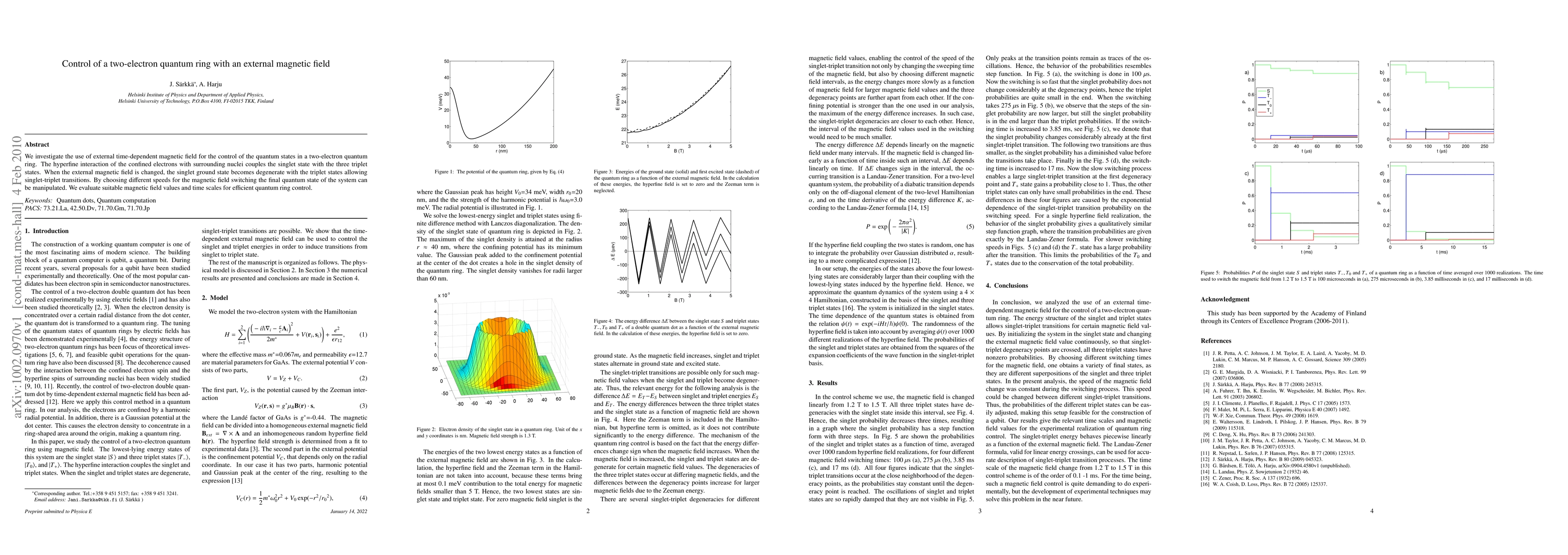 The paper presents a theoretical framework for controlling two-electron quantum ring states using time-dependent magnetic fields, including the analysis of singlet-triplet transitions and their dependence on magnetic field changes.