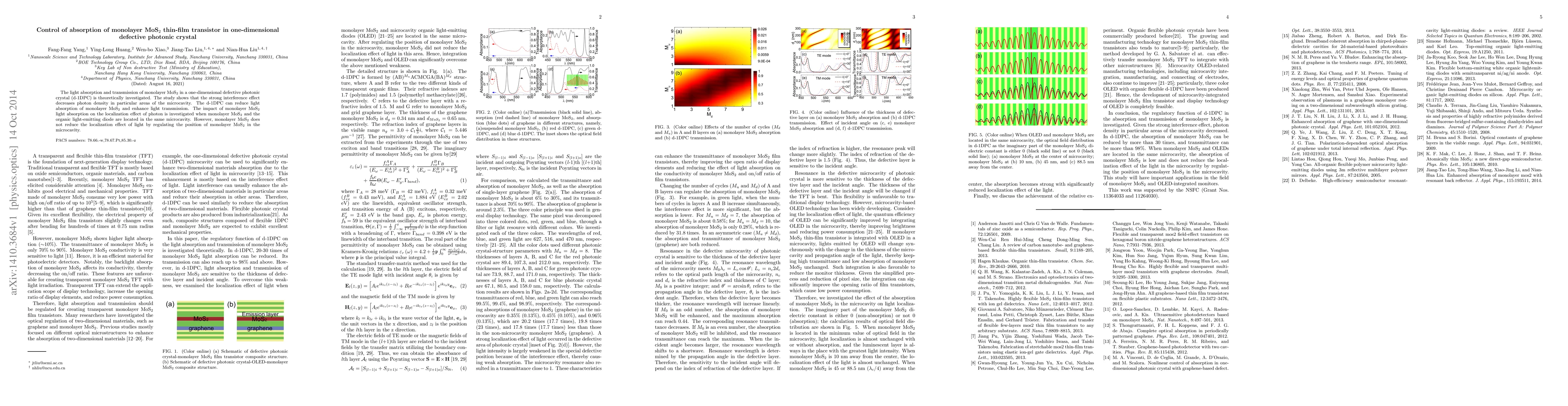This study investigates the control of light absorption in monolayer MoS$_2$ thin-film transistors embedded in a one-dimensional defective photonic crystal (d-1DPC). The d-1DPC reduces monolayer MoS$_2$ light absorption and enhances transmission, though it does not mitigate the localization effect of photons when positioned within the same microcavity.