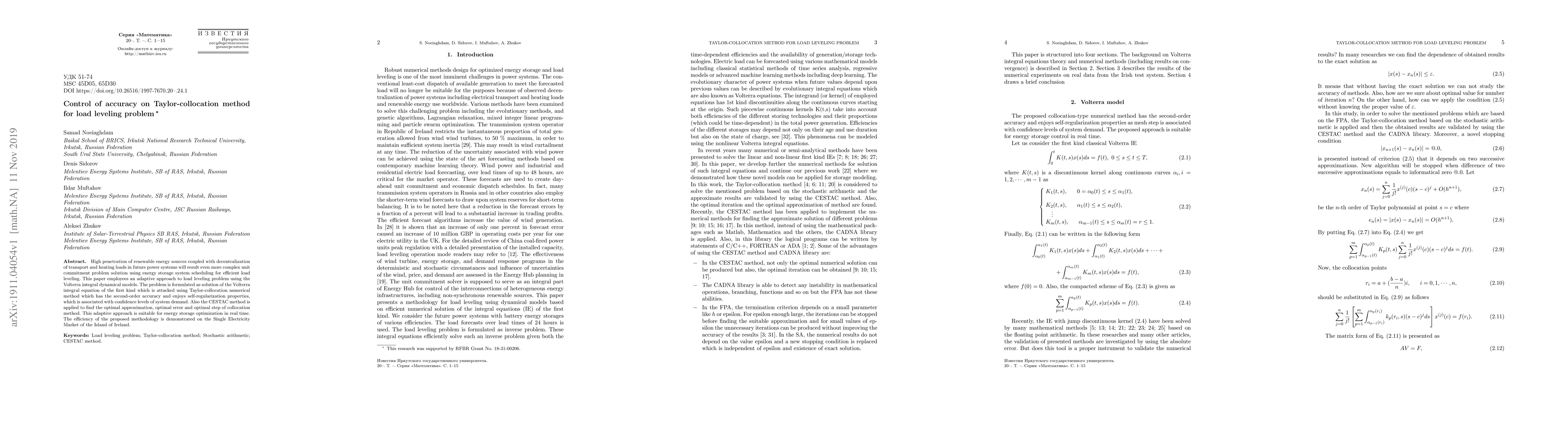This paper proposes an adaptive Taylor-collocation method for solving the complex load leveling problem in future power systems with high renewable energy penetration. The method achieves second-order accuracy and optimal error approximation, demonstrated through the CESTAC method, and is shown to be effective for real-time energy storage optimization in the Single Electricity Market of the Island of Ireland.