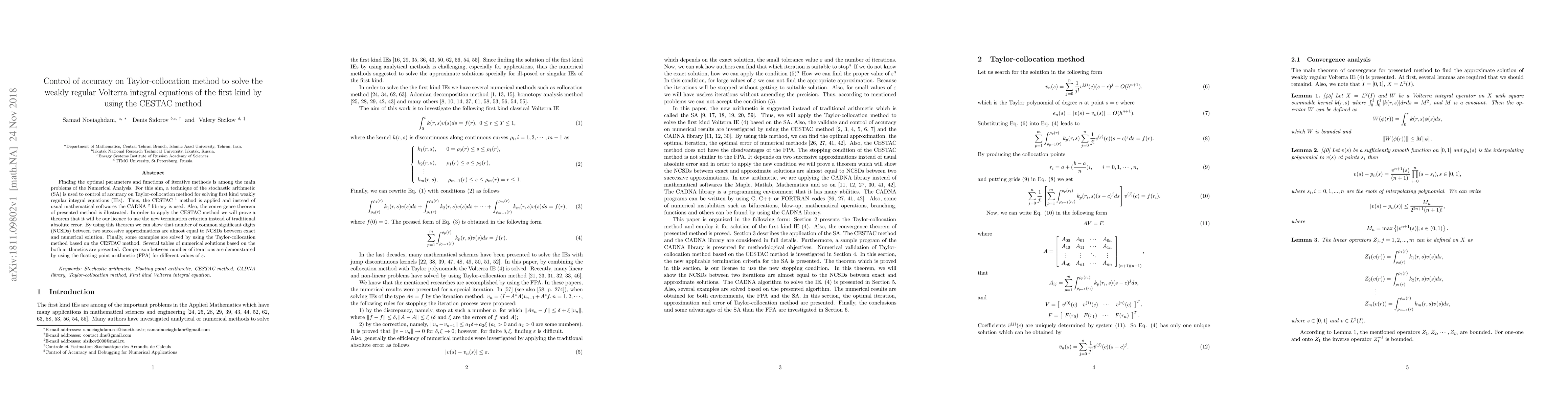 This paper proposes a CESTAC method to enhance the accuracy of the Taylor-collocation method for solving first kind weakly regular Volterra integral equations. It utilizes stochastic arithmetic and CADNA library for improved control over numerical accuracy, demonstrating convergence and comparing iterations against floating point arithmetic.