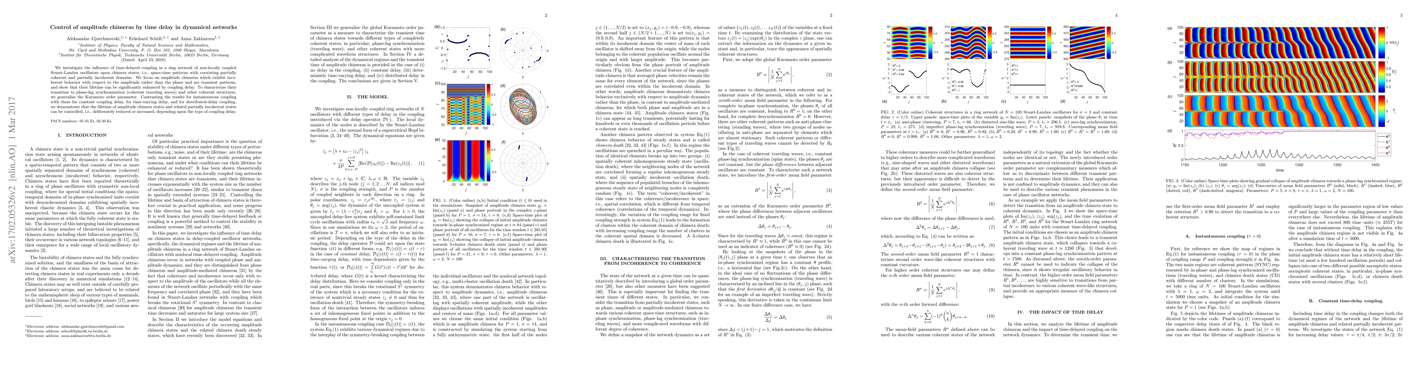 This paper explores how time-delayed coupling in a network of Stuart-Landau oscillators affects amplitude chimera states, transient patterns with coexisting coherent and incoherent regions. It demonstrates that the lifetime of these chimeras can be significantly extended by coupling delay, and it introduces a generalized Kuramoto order parameter to characterize transitions to coherent synchronization.