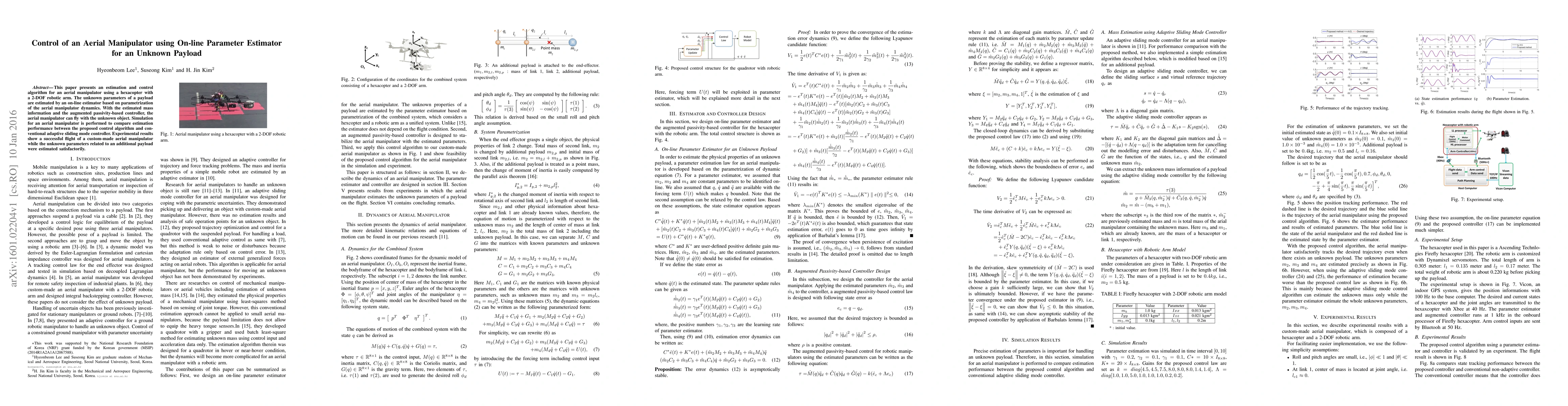 This paper proposes an estimation and control algorithm for an aerial manipulator using a hexacopter with a 2-DOF robotic arm, estimating unknown payload parameters via an on-line estimator. Simulation results show improved performance over conventional adaptive sliding mode controllers, validated by successful flight tests with an estimated payload.