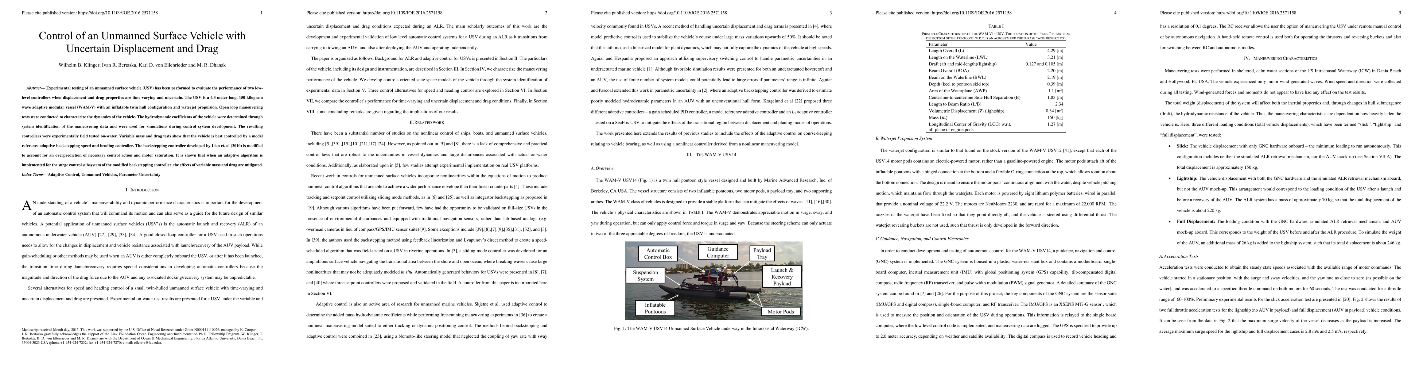 Experimental testing of an unmanned surface vehicle (USV) has been performed to evaluate the performance of two low-level controllers when displacement and drag properties are time-varying and uncertain. The USV is a 4.3 meter long, 150 kilogram wave adaptive modular vessel (WAM-V) with an inflatable twin hull configuration and waterjet propulsion. Open loop maneuvering tests were conducted to characterize the dynamics of the vehicle. The hydrodynamic coefficients of the vehicle were determined through system identification of the maneuvering data and were used for simulations during control system development. The resulting controllers were experimentally field tested on-water. Variable mass and drag tests show that the vehicle is best controlled by a model reference adaptive backstepping speed and heading controller. The backstepping controller developed by Liao et. al (2010) is modified to account for an overprediction of necessary control action and motor saturation. It is shown that when an adaptive algorithm is implemented for the surge control subsystem of the modified backstepping controller, the effects of variable mass and drag are mitigated.