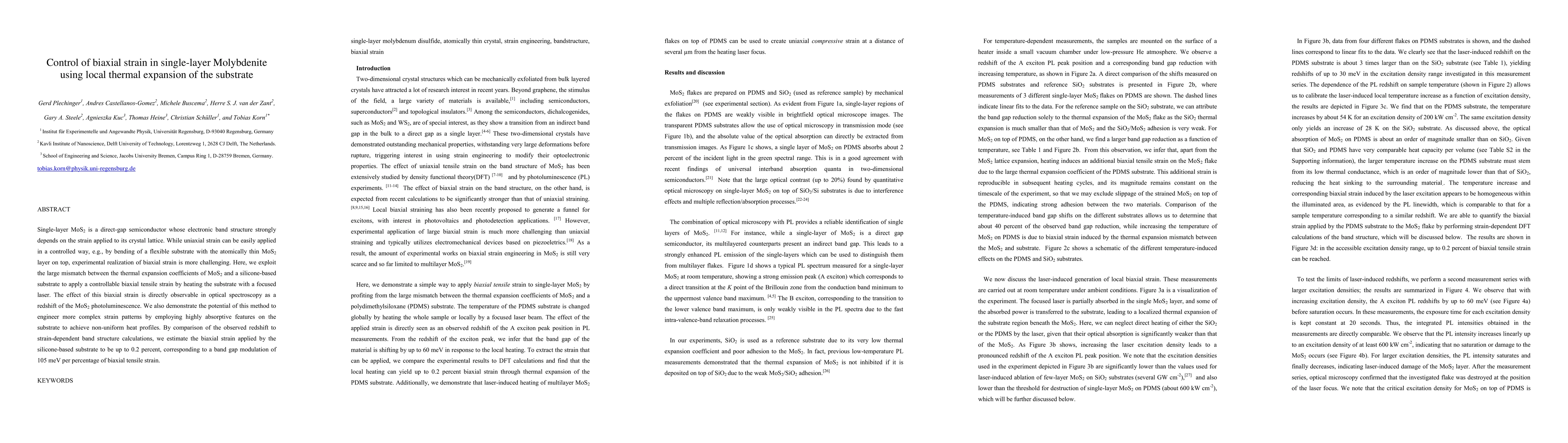 This paper details a method to apply controllable biaxial strain to single-layer MoS2 using the local thermal expansion of a silicone-based substrate, demonstrating a significant redshift in photoluminescence and estimating a band gap modulation of 105 meV per percentage of strain. The technique also allows for the creation of non-uniform strain patterns.