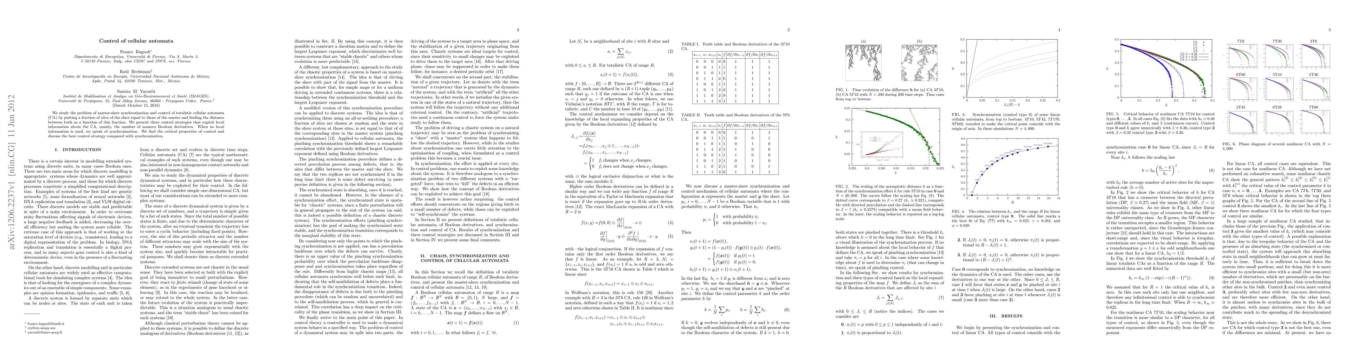 We study the problem of master-slave synchronization and control of totalistic cellular automata (CA) by putting a fraction of sites of the slave equal to those of the master and finding the distance between both as a function of this fraction. We present three control strategies that exploit local information about the CA, mainly, the number of nonzero Boolean derivatives. When no local information is used, we speak of synchronization. We find the critical properties of control and discuss the best control strategy compared with synchronization.