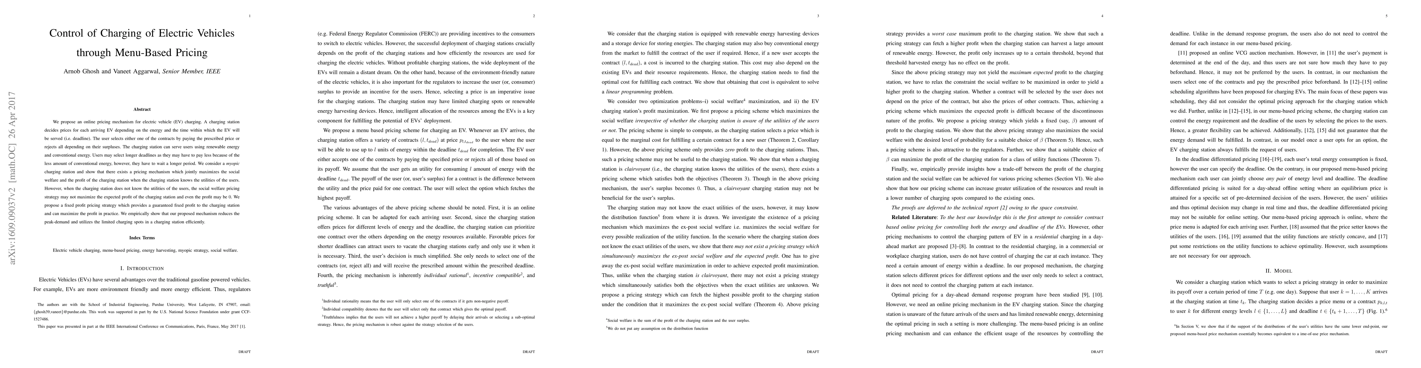 We propose an online pricing mechanism for electric vehicle (EV) charging. A charging station decides prices for each arriving EV depending on the energy and the time within which the EV will be served (i.e. deadline). The user selects either one of the contracts by paying the prescribed price or rejects all depending on their surpluses. The charging station can serve users using renewable energy and conventional energy. Users may select longer deadlines as they may have to pay less because of the less amount of conventional energy, however, they have to wait a longer period. We consider a {\em myopic} charging station and show that there exists a pricing mechanism which jointly maximizes the social welfare and the profit of the charging station when the charging station knows the utilities of the users. However, when the charging station does not know the utilities of the users, the social welfare pricing strategy may not maximize the expected profit of the charging station and even the profit may be $0$. We propose a fixed profit pricing strategy which provides a guaranteed fixed profit to the charging station and can maximize the profit in practice. We empirically show that our proposed mechanism reduces the peak-demand and utilizes the limited charging spots in a charging station efficiently.