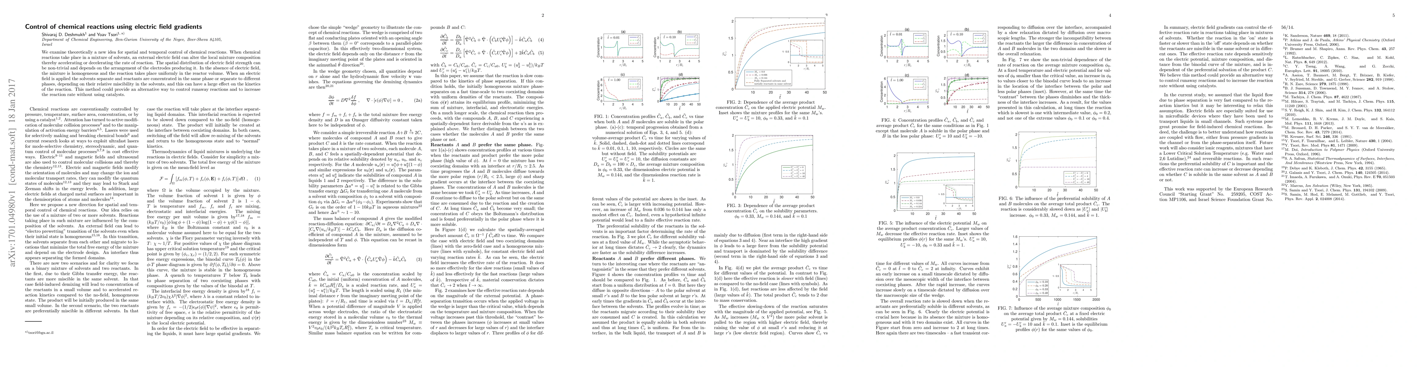 This paper explores the theoretical potential of using electric field gradients to spatially and temporally control chemical reactions by altering solvent composition and reaction rates. The method suggests that applying an electric field can concentrate reactants or separate them into different phases, thereby accelerating or decelerating reactions without catalysts.