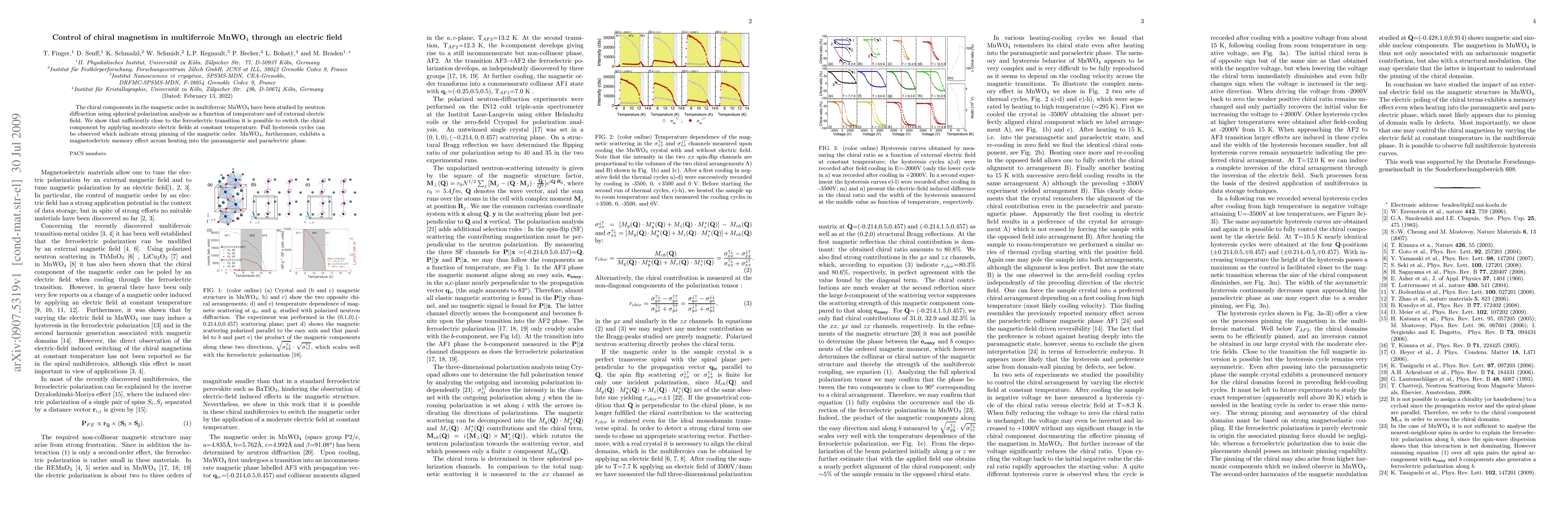 Summary: The study demonstrates that electric fields can control the chiral magnetic order in multiferroic MnWO4, showing full hysteresis cycles near the ferroelectric transition and a magnetoelectric memory effect even beyond the paramagnetic phase.