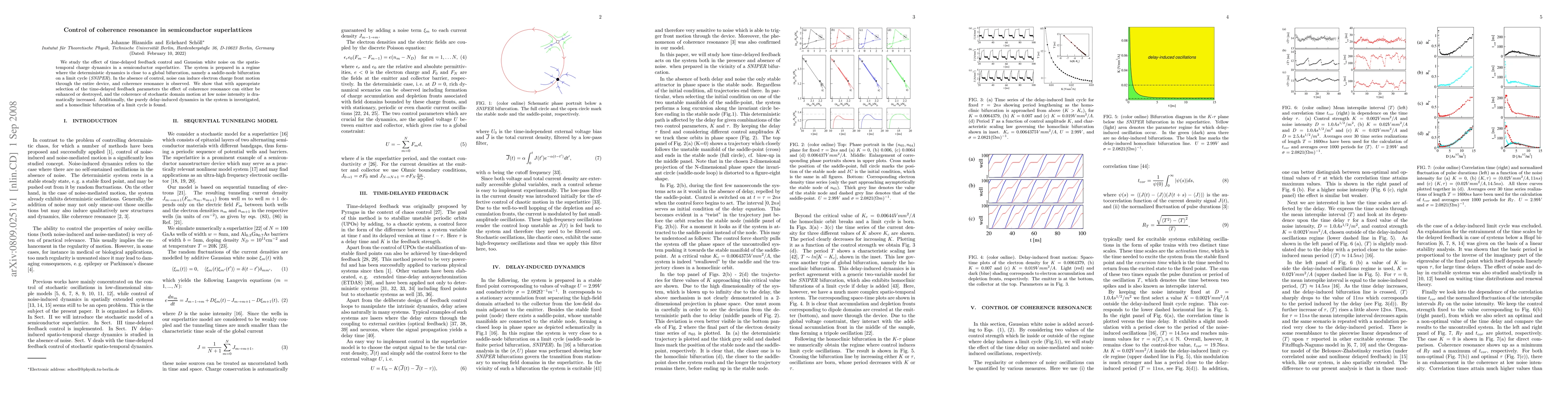 This paper investigates how time-delayed feedback control and Gaussian white noise influence charge dynamics in semiconductor superlattices, particularly near a saddle-node bifurcation on a limit cycle. The study reveals that appropriate feedback can either enhance or suppress coherence resonance, and significantly increases coherence in stochastic domain motion at low noise levels.