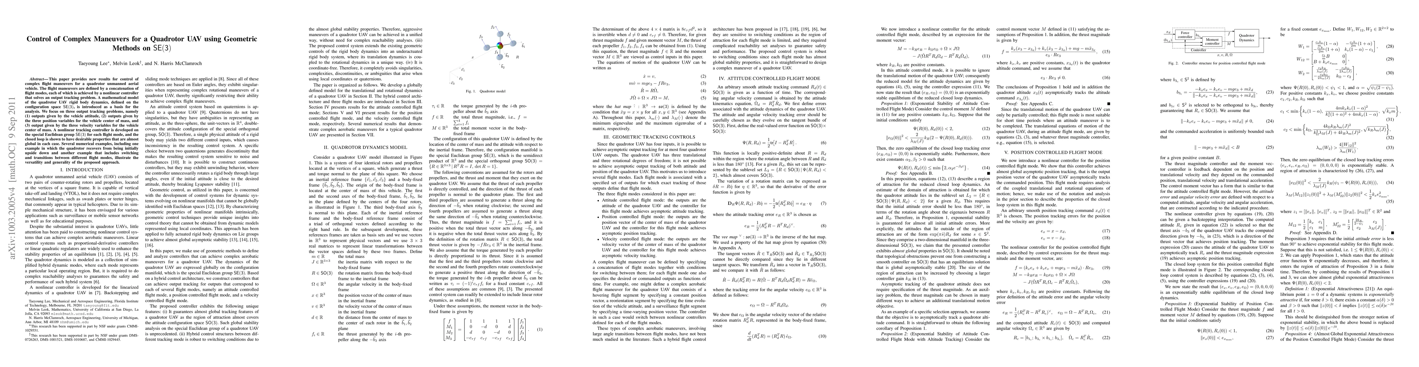 This paper develops a nonlinear controller for complex maneuvers of a quadrotor UAV using geometric methods on the special Euclidean group $\SE(3)$. The controller solves optimal tracking problems for vehicle attitude, position, and velocity, demonstrating almost global closed-loop properties and versatility through numerical examples.