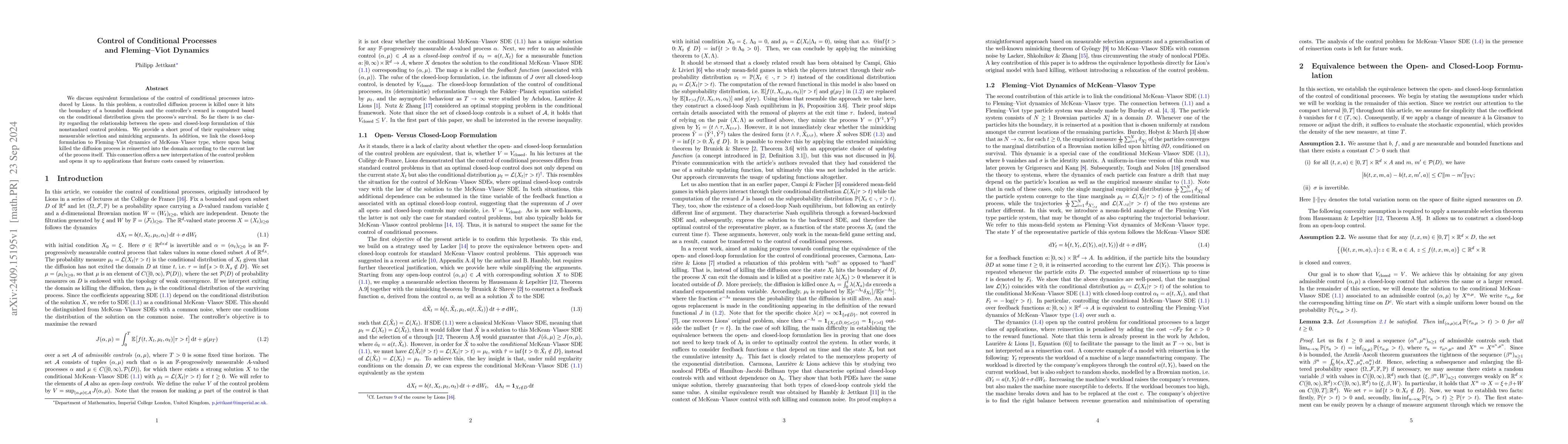 We discuss equivalent formulations of the control of conditional processes introduced by Lions. In this problem, a controlled diffusion process is killed once it hits the boundary of a bounded domain and the controller's reward is computed based on the conditional distribution given the process's survival. So far there is no clarity regarding the relationship between the open- and closed-loop formulation of this nonstandard control problem. We provide a short proof of their equivalence using measurable selection and mimicking arguments. In addition, we link the closed-loop formulation to Fleming--Viot dynamics of McKean--Vlasov type, where upon being killed the diffusion process is reinserted into the domain according to the current law of the process itself. This connection offers a new interpretation of the control problem and opens it up to applications that feature costs caused by reinsertion.