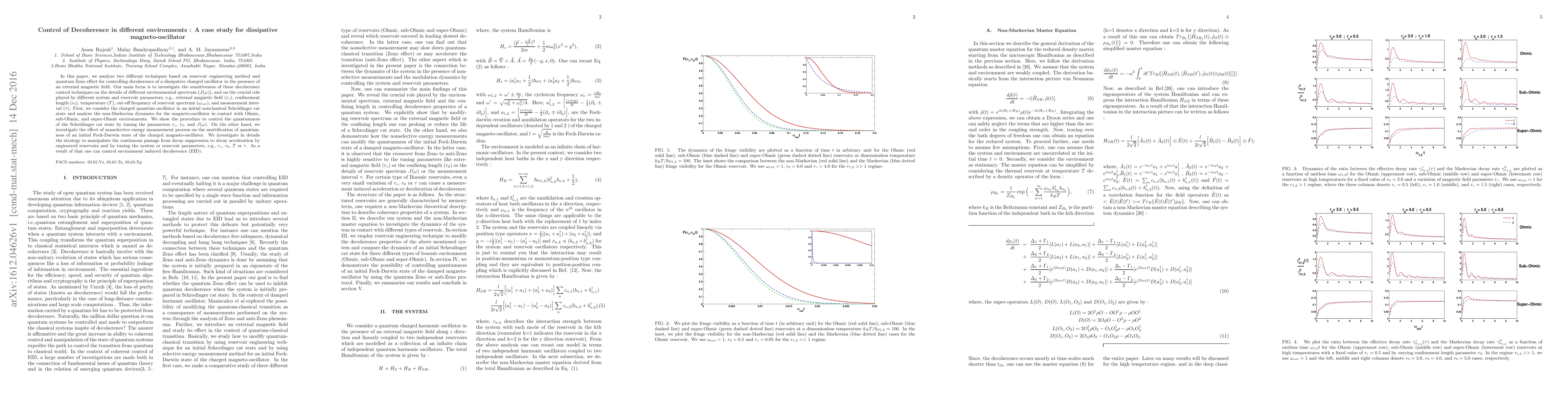 In this paper, we analyze two different techniques based on reservoir engineering method and quantum Zeno effect for controlling decoherence of a dissipative charged oscillator in the presence of an external magnetic field. Our main focus is to investigate the sensitiveness of these decoherence control techniques on the details of different environmental spectrum ($J(\omega)$), and on the crucial role played by different system and reservoir parameters, e.g., external magnetic field ($r_c$), confinement length ($r_0$), temperature (T), cut-off frequency of reservoir spectrum ($\omega_{cut}$), and measurement interval ($\tau$). First, we consider the charged quantum oscillator in an initial nonclassical Schrodinger cat state and analyze the non-Markovian dynamics for the magneto-oscillator in contact with Ohmic, sub-Ohmic, and super-Ohmic environments. We show the procedure to control the quantumness of the Schrodinger cat state by tuning the parameters $r_c$, $r_0$, and $J(\omega)$. On the other hand, we investigate the effect of nonselective energy measurement process on the mortification of quantumness of an initial Fock-Darwin state of the charged magneto-oscillator. We investigate in details the strategy to manipulate the continuous passage from decay suppression to decay acceleration by engineered reservoirs and by tuning the system or reservoir parameters, e.g., $r_c$, $r_0$, T or $\tau$. As a result of that one can control environment induced decoherence (EID).