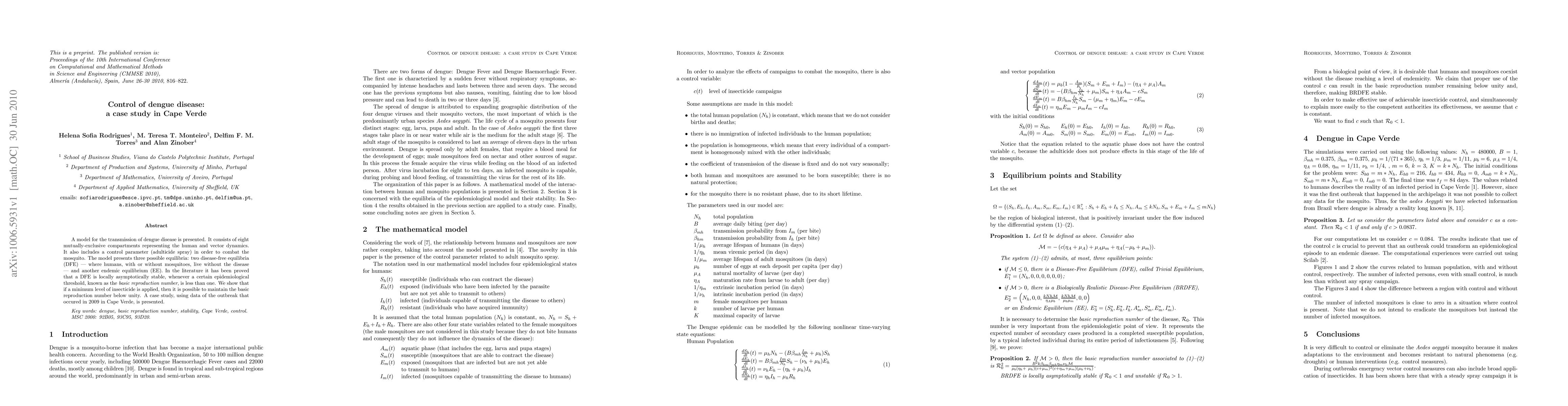 This paper presents a model for dengue disease transmission with eight compartments representing human and vector dynamics, including a control parameter for mosquito control via adulticide spray. The model demonstrates that maintaining the basic reproduction number below one through sufficient insecticide application can achieve disease-free equilibria, as demonstrated in a case study of the 2009 outbreak in Cape Verde.