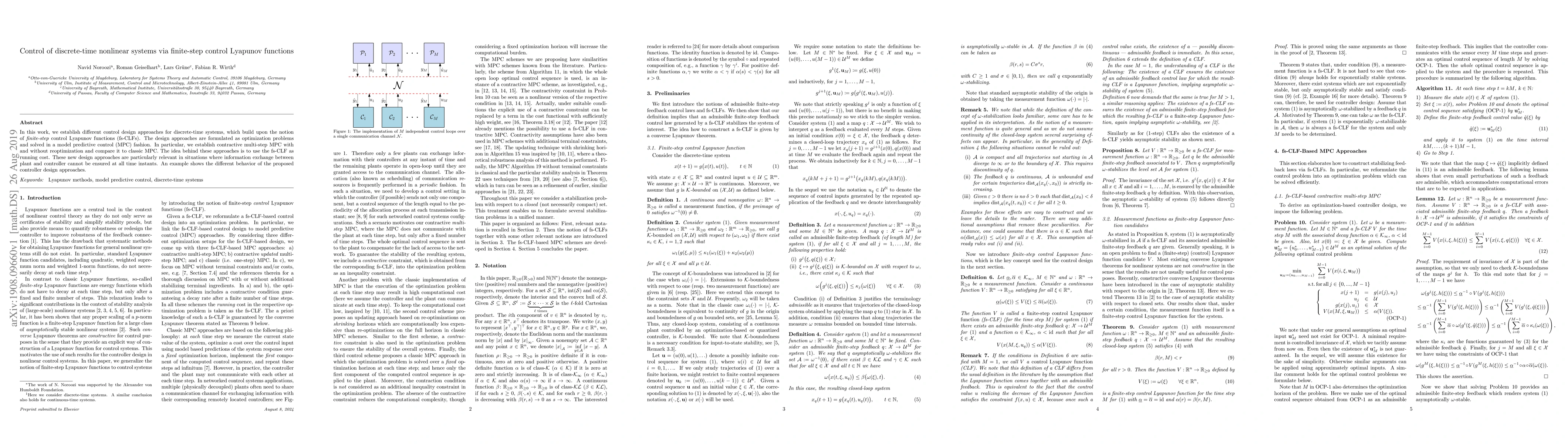 This paper proposes control design methods for discrete-time nonlinear systems using finite-step control Lyapunov functions (fs-CLFs) formulated as optimization problems solved via model predictive control (MPC). It compares contractive multi-step MPC with and without reoptimization against classic MPC, highlighting their relevance in intermittent information exchange scenarios.
