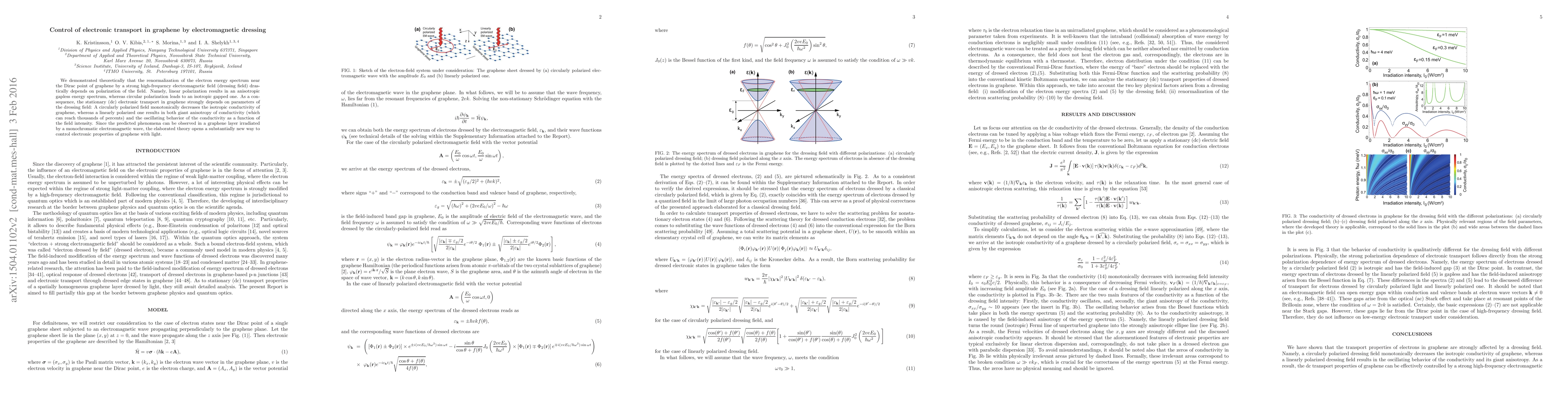 We demonstrated theoretically that the renormalization of the electron energy spectrum near the Dirac point of graphene by a strong high-frequency electromagnetic field (dressing field) drastically depends on polarization of the field. Namely, linear polarization results in an anisotropic gapless energy spectrum, whereas circular polarization leads to an isotropic gapped one. As a consequence, the stationary (dc) electronic transport in graphene strongly depends on parameters of the dressing field: A circularly polarized field monotonically decreases the isotropic conductivity of graphene, whereas a linearly polarized one results in both giant anisotropy of conductivity (which can reach thousands of percents) and the oscillating behavior of the conductivity as a function of the field intensity. Since the predicted phenomena can be observed in a graphene layer irradiated by a monochromatic electromagnetic wave, the elaborated theory opens a substantially new way to control electronic properties of graphene with light.