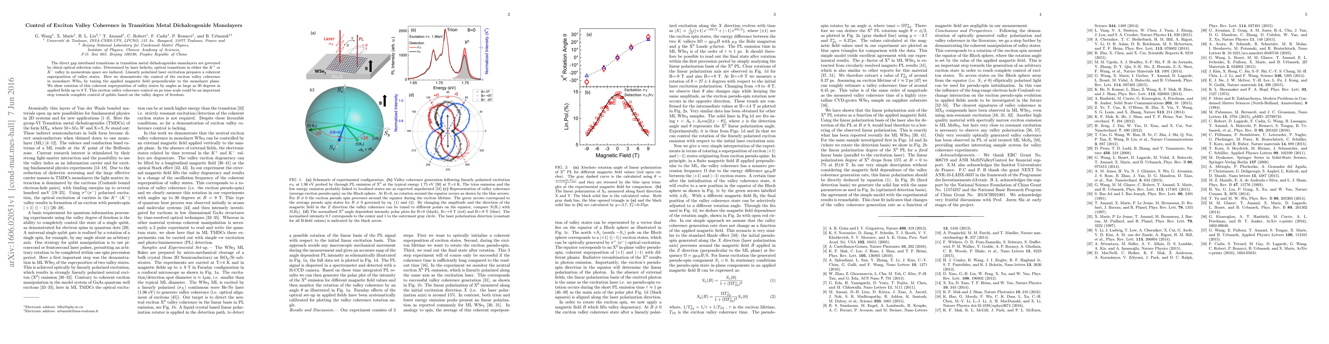 This paper demonstrates the control of exciton valley coherence in monolayer WSe2 by applying a magnetic field perpendicular to the plane, achieving rotations of up to 30 degrees in coherent valley states. This control over valley coherence on picosecond timescales could advance the development of valley-based qubits.