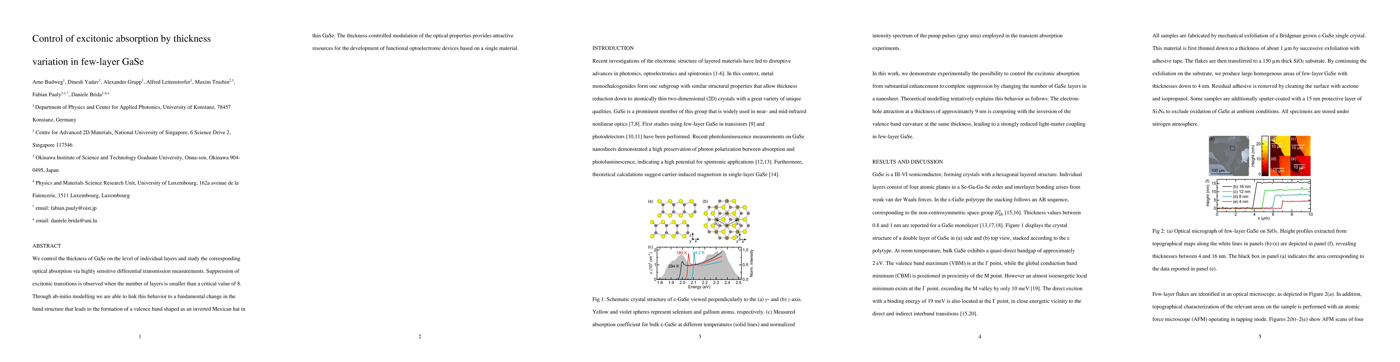 This study demonstrates that reducing the thickness of GaSe to fewer than 8 layers suppresses excitonic transitions, linked to a band structure change forming an inverted Mexican hat valence band. This thickness-controlled modulation of optical properties offers potential for advanced optoelectronic devices.