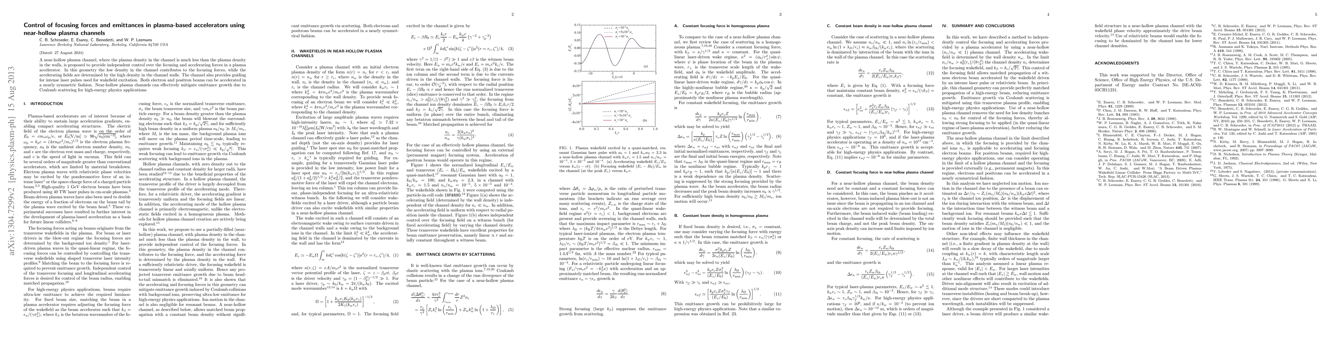The research proposes using near-hollow plasma channels for independent control of focusing and accelerating forces in plasma accelerators. This geometry allows for effective mitigation of emittance growth due to Coulomb scattering, benefiting high-energy physics applications with potential for symmetric acceleration of both electron and positron beams.