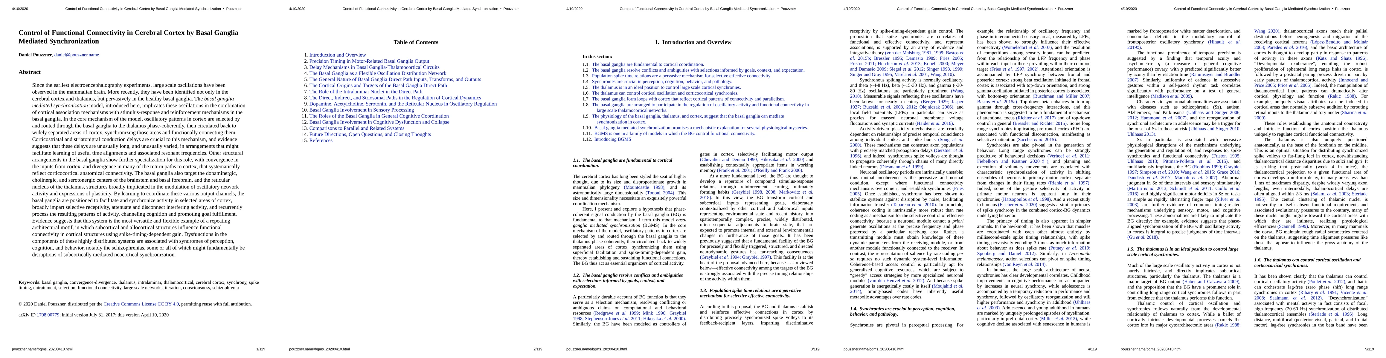 Since the earliest electroencephalography experiments, large scale oscillations have been observed in the mammalian brain. More recently, they have been identified not only in the cerebral cortex and thalamus, but pervasively in the healthy basal ganglia. The basal ganglia mediated synchronization model, introduced here, implicates these oscillations in the combination of cortical association mechanisms with stimulus-response and reinforcement mechanisms in the basal ganglia. In the core mechanism of the model, oscillatory patterns in cortex are selected by and routed through the basal ganglia to the thalamus phase-coherently, then circulated back to widely separated areas of cortex, synchronizing those areas and functionally connecting them. Corticostriatal and striatonigral conduction delays are crucial to this mechanism, and evidence suggests that these delays are unusually long, and unusually varied, in arrangements that might facilitate learning of useful time alignments and associated resonant frequencies. Other structural arrangements in the basal ganglia show further specialization for this role, with convergence in the inputs from cortex, and divergence in many of the return paths to cortex, that systematically reflect corticocortical anatomical connectivity. The basal ganglia also target the dopaminergic, cholinergic, and serotonergic centers of the brainstem and basal forebrain, and the reticular nucleus of the thalamus, structures broadly implicated in the modulation of oscillatory network activity and expressions of plasticity. By learning to coordinate these various output channels, the basal ganglia are positioned to facilitate and synchronize activity in selected areas of cortex, broadly impart selective receptivity, attenuate and disconnect interfering activity, and recurrently process the resulting patterns of activity, channeling cognition and promoting goal [...]