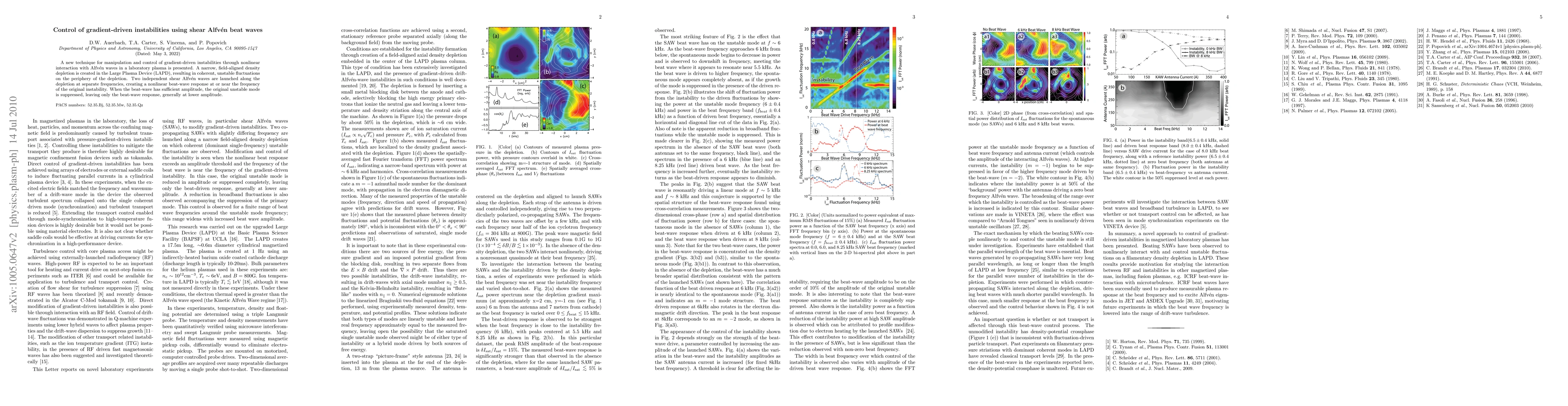 A new technique for manipulation and control of gradient-driven instabilities through nonlinear interaction with Alfv\'en waves in a laboratory plasma is presented. A narrow field-aligned density depletion is created in the Large Plasma Device (LAPD), resulting in coherent unstable fluctuations on the periphery of the depletion. Two independent kinetic Alfv\'en waves are launched along the depletion at separate frequencies, creating a nonlinear beat-wave response at or near the frequency of the original instability. When the beat-wave has sufficient amplitude, the original unstable mode is suppressed, leaving only the beat-wave response at a different frequency, generally at lower amplitude.