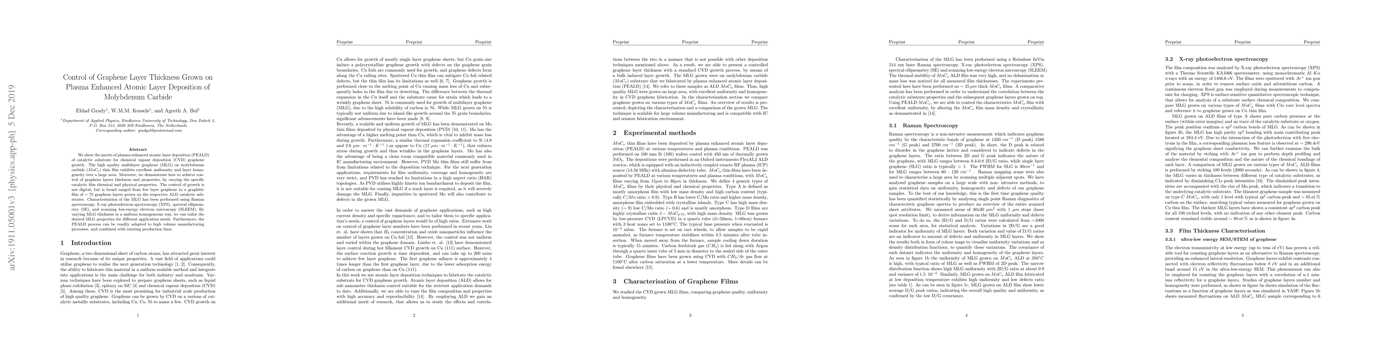 This study demonstrates the use of plasma enhanced atomic layer deposition (PEALD) to control the thickness and properties of multilayer graphene (MLG) grown on molybdenum carbide ($MoC_{x}$) substrates. The MLG exhibits excellent uniformity and can be tailored from few layers to approximately 75 layers, enabling versatile application needs.