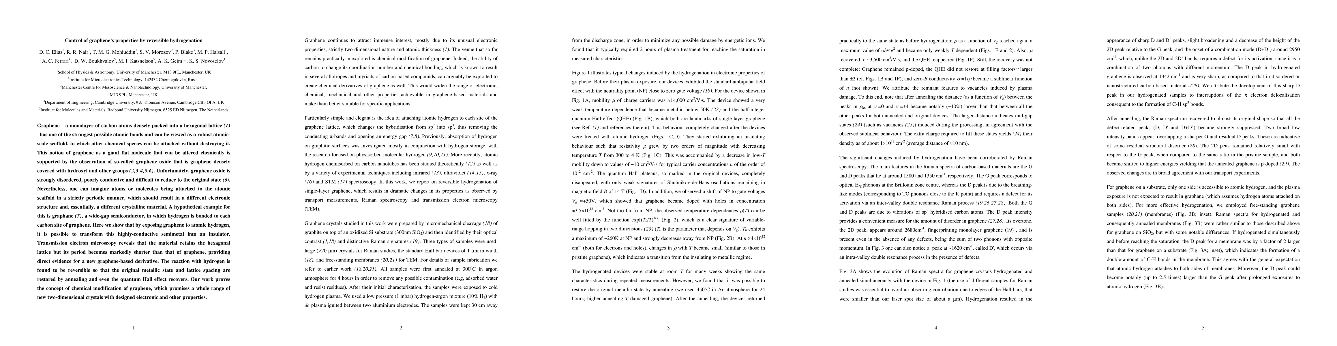 Graphene - a monolayer of carbon atoms densely packed into a hexagonal lattice - has one of the strongest possible atomic bonds and can be viewed as a robust atomic-scale scaffold, to which other chemical species can be attached without destroying it. This notion of graphene as a giant flat molecule that can be altered chemically is supported by the observation of so-called graphene oxide, that is graphene densely covered with hydroxyl and other groups. Unfortunately, graphene oxide is strongly disordered, poorly conductive and difficult to reduce to the original state. Nevertheless, one can imagine atoms or molecules being attached to the atomic scaffold in a strictly periodic manner, which should result in a different electronic structure and, essentially, a different crystalline material. A hypothetical example for this is graphane, a wide-gap semiconductor, in which hydrogen is bonded to each carbon site of graphene. Here we show that by exposing graphene to atomic hydrogen, it is possible to transform this highly-conductive semimetal into an insulator. Transmission electron microscopy reveals that the material retains the hexagonal lattice but its period becomes markedly shorter than that of graphene, providing direct evidence for a new graphene-based derivative. The reaction with hydrogen is found to be reversible so that the original metallic state and lattice spacing are restored by annealing and even the quantum Hall effect recovers. Our work proves the concept of chemical modification of graphene, which promises a whole range of new two-dimensional crystals with designed electronic and other properties.