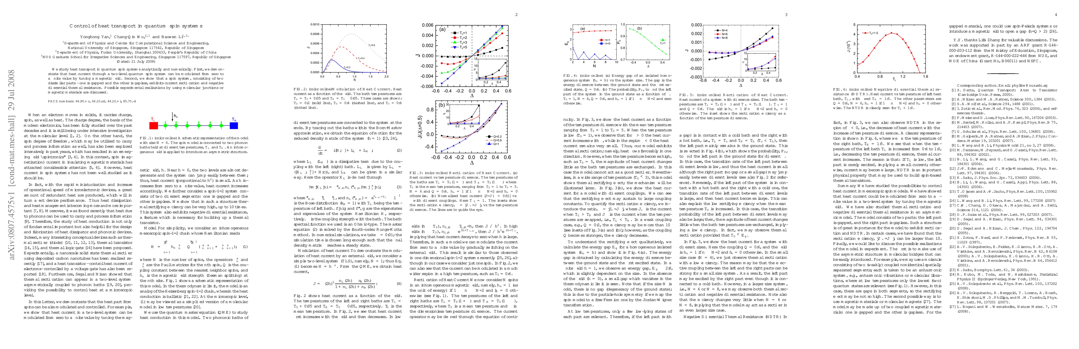 This paper investigates heat transport in quantum spin systems, demonstrating modulation of heat current through a two-level spin system via magnetic field tuning, and current rectification and negative differential thermal resistance in spin systems with differing gap characteristics. Experimental applications in molecular junctions or magnetic materials are proposed.