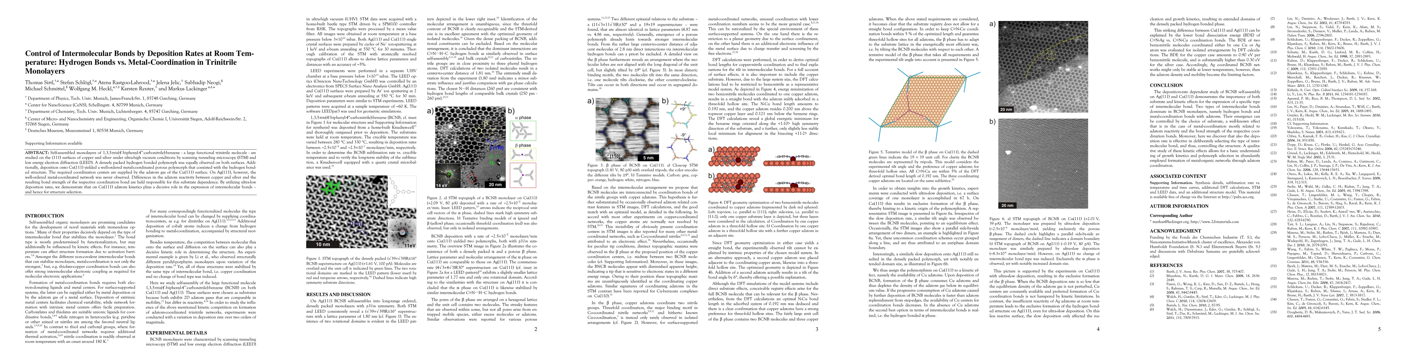 Researchers investigated how deposition rates at room temperature influence the formation of intermolecular bonds in trinitrile monolayers on copper and silver surfaces, finding that adatom kinetics plays a crucial role in structure selection.