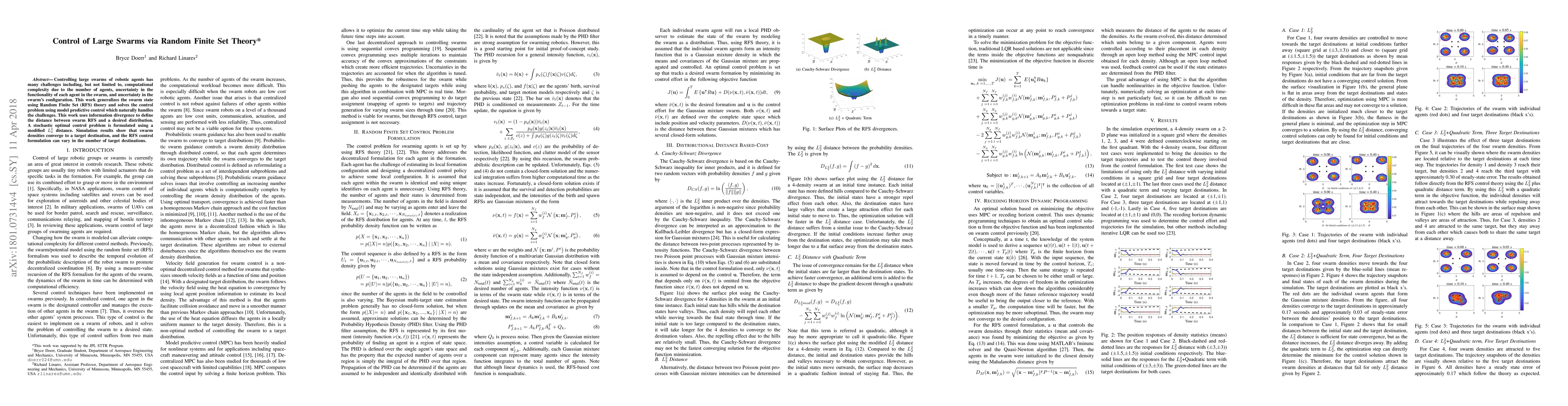 Controlling large swarms of robotic agents has many challenges including, but not limited to, computational complexity due to the number of agents, uncertainty in the functionality of each agent in the swarm, and uncertainty in the swarm's configuration. This work generalizes the swarm state using Random Finite Set (RFS) theory and solves the control problem using model predictive control which naturally handles the challenges. This work uses information divergence to define the distance between swarm RFS and a desired distribution. A stochastic optimal control problem is formulated using a modified L2 distance. Simulation results show that swarm densities converge to a target destination, and the RFS control formulation can vary in the number of target destinations.