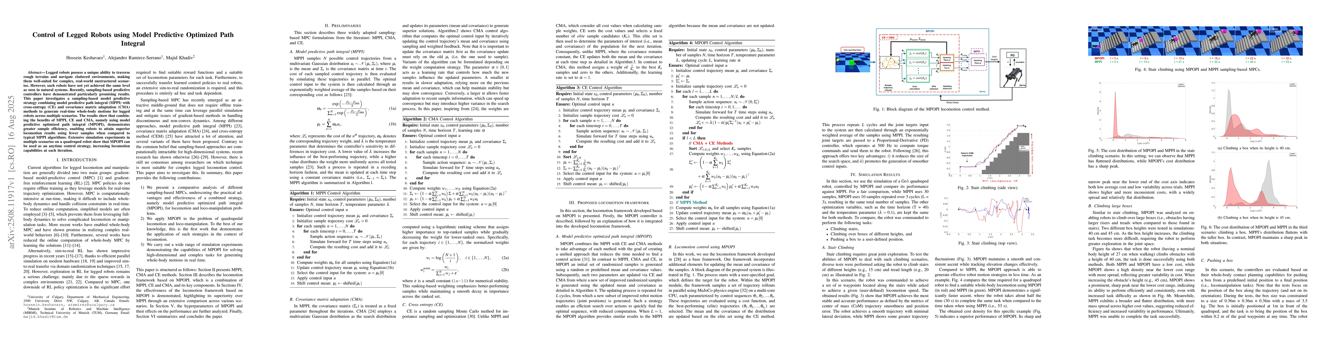 Legged robots possess a unique ability to traverse rough terrains and navigate cluttered environments, making them well-suited for complex, real-world unstructured scenarios. However, such robots have not yet achieved the same level as seen in natural systems. Recently, sampling-based predictive controllers have demonstrated particularly promising results. This paper investigates a sampling-based model predictive strategy combining model predictive path integral (MPPI) with cross-entropy (CE) and covariance matrix adaptation (CMA) methods to generate real-time whole-body motions for legged robots across multiple scenarios. The results show that combining the benefits of MPPI, CE and CMA, namely using model predictive optimized path integral (MPOPI), demonstrates greater sample efficiency, enabling robots to attain superior locomotion results using fewer samples when compared to typical MPPI algorithms. Extensive simulation experiments in multiple scenarios on a quadruped robot show that MPOPI can be used as an anytime control strategy, increasing locomotion capabilities at each iteration.