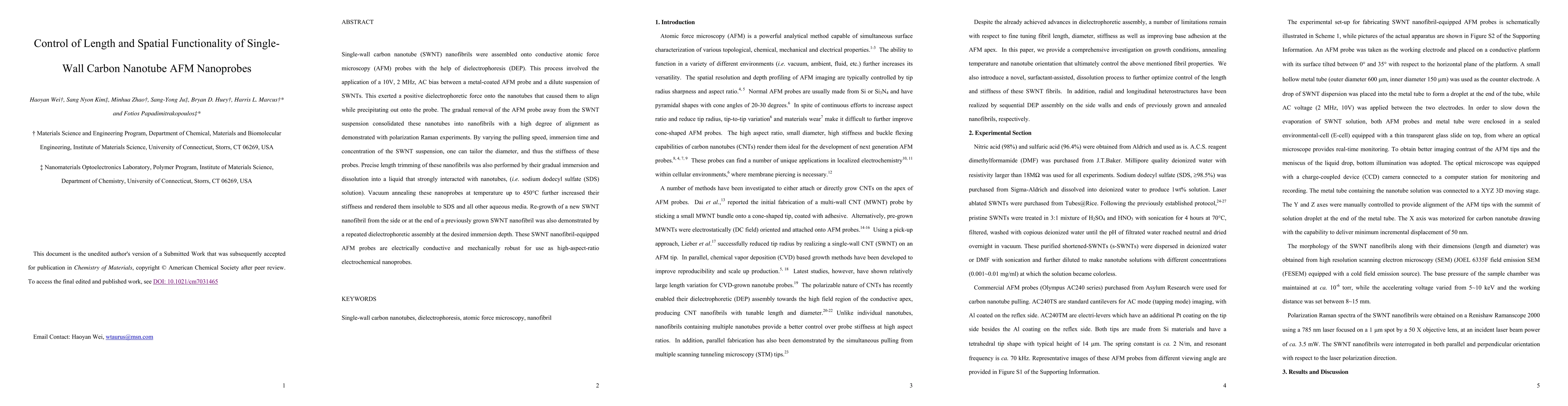 Single-wall carbon nanotube (SWNT) nanofibrils were assembled onto conductive atomic force microscopy (AFM) probes with the help of dielectrophoresis (DEP). This process involved the application of a 10 V, 2 MHz, AC bias between a metal-coated AFM probe and a dilute suspension of SWNTs. This exerted a positive dielectrophoretic force onto the nanotubes that caused them to align while precipitating out onto the probe. The gradual removal of the AFM probe away from the SWNT suspension consolidated these nanotubes into nanofibrils with a high degree of alignment as demonstrated with polarization Raman experiments. By varying the pulling speed, immersion time, and concentration of the SWNT suspension, one can tailor the diameter and thus the stiffness of these probes. Precise length trimming of these nanofibrils was also performed by their gradual immersion and dissolution into a liquid that strongly interacted with nanotubes, (i.e., sodium dodecyl sulfate (SDS) solution). Vacuum annealing these nanoprobes at temperature up to 450 degree C further increased their stiffness and rendered them insoluble to SDS and all other aqueous media. Regrowth of a new SWNT nanofibril from the side or at the end of a previously grown SWNT nanofibril was also demonstrated by a repeated dielectrophoretic assembly at the desired immersion depth. These SWNT nanofibril-equipped AFM probes are electrically conductive and mechanically robust for use as high-aspect-ratio electrochemical nanoprobes.
