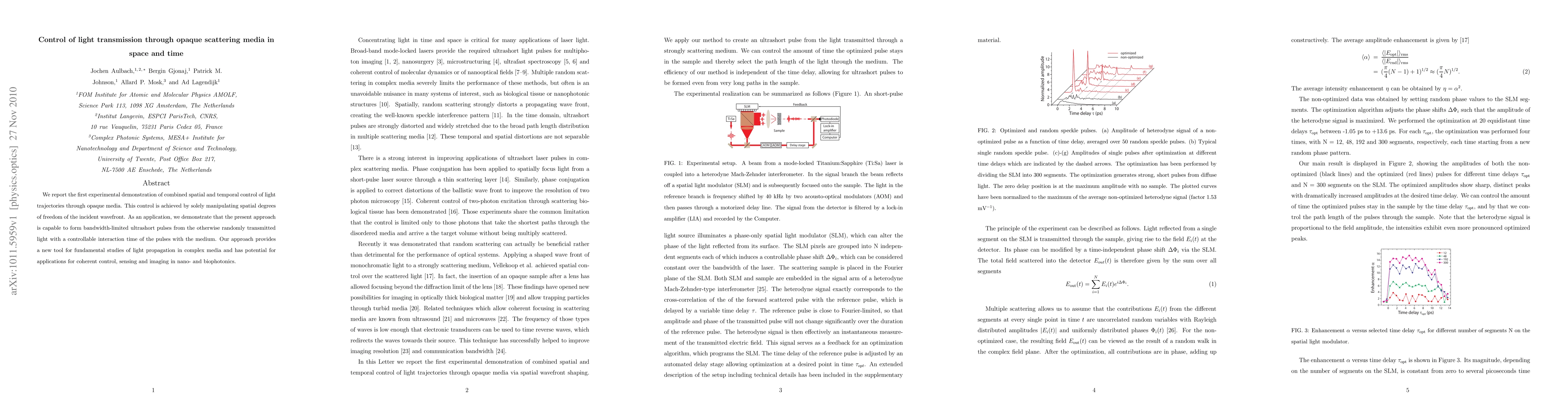 This paper demonstrates the first experimental control of light transmission through opaque scattering media by manipulating spatial degrees of freedom, enabling the formation of bandwidth-limited ultrashort pulses. This approach offers new tools for fundamental studies and potential applications in coherent control, sensing, and imaging in nano- and biophotonics.
