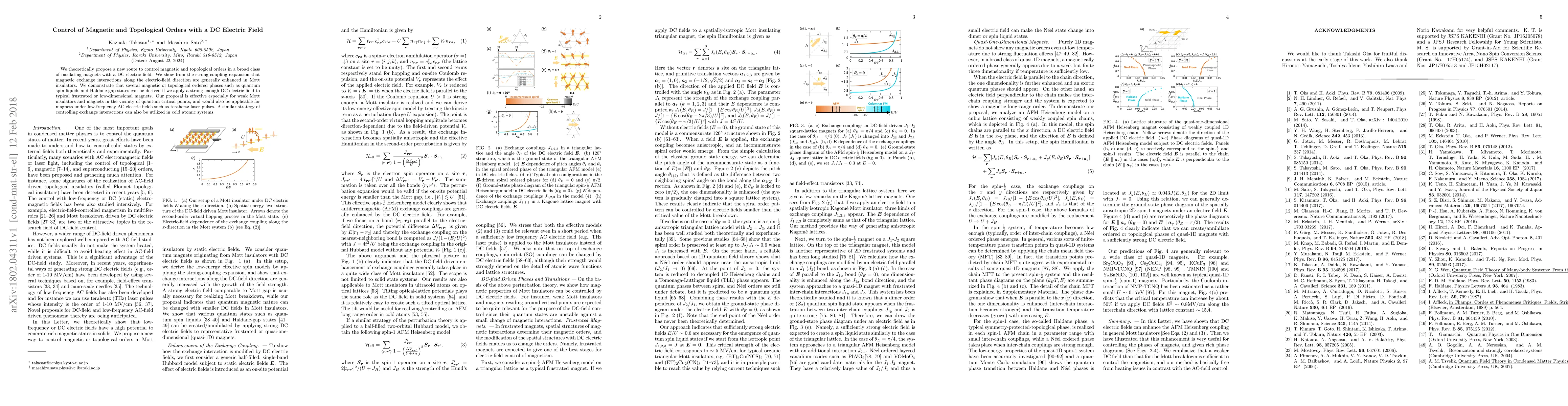 We theoretically propose a new route to control magnetic and topological orders in a broad class of insulating magnets with a DC electric field. We show from the strong-coupling expansion that magnetic exchange interactions along the electric-field direction are generally enhanced in Mott insulators. We demonstrate that several magnetic or topological ordered phases such as quantum spin liquids and Haldane-gap states can be derived if we apply a strong enough DC electric field to typical frustrated or low-dimensional magnets. Our proposal is effective especially for weak Mott insulators and magnets in the vicinity of quantum critical points, and would also be applicable for magnets under low-frequency AC electric fields such as terahertz laser pulses. A similar strategy of controlling exchange interactions can also be utilized in cold atomic systems.