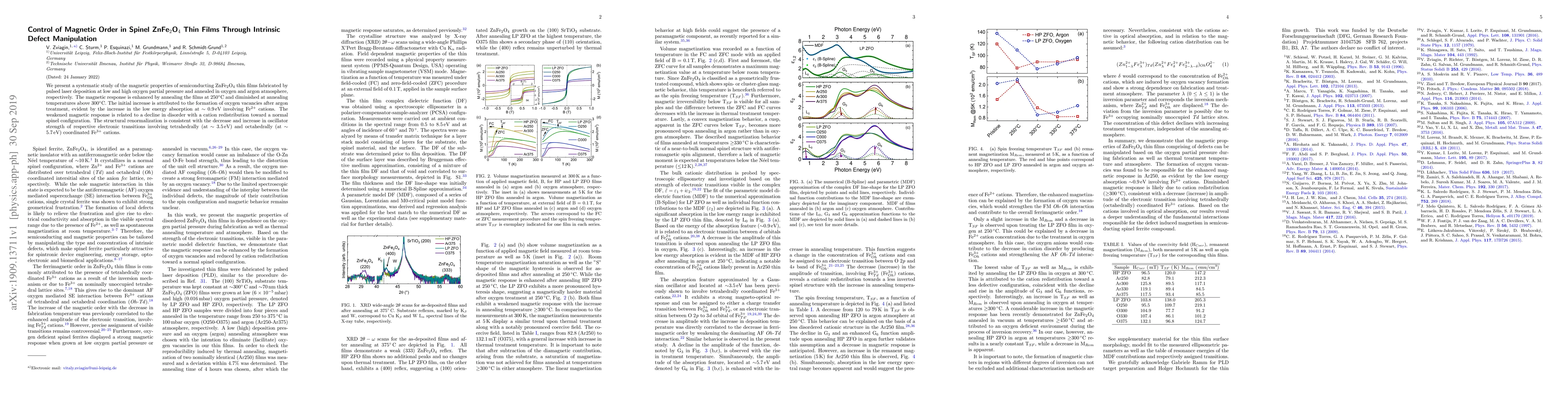 We present a systematic study of the magnetic properties of semiconducting ZnFe$_2$O$_4$ thin films fabricated by pulsed laser deposition at low and high oxygen partial pressure and annealed in oxygen and argon atmosphere, respectively. The magnetic response is enhanced by annealing the films at 250$^{\circ}$C and diminished at annealing temperatures above 300$^{\circ}$C. The initial increase is attributed to the formation of oxygen vacancies after argon treatment, evident by the increase in the low energy absorption at $\sim$ 0.9 eV involving Fe$^{2+}$ cations. The weakened magnetic response is related to a decline in disorder with a cation redistribution toward a normal spinel configuration. The structural renormalization is consistent with the decrease and increase in oscillator strength of respective electronic transitions involving tetrahedrally (at $\sim$ 3.5 eV) and octahedrally (at $\sim$ 5.7 eV) coordinated Fe$^{3+}$ cations.
