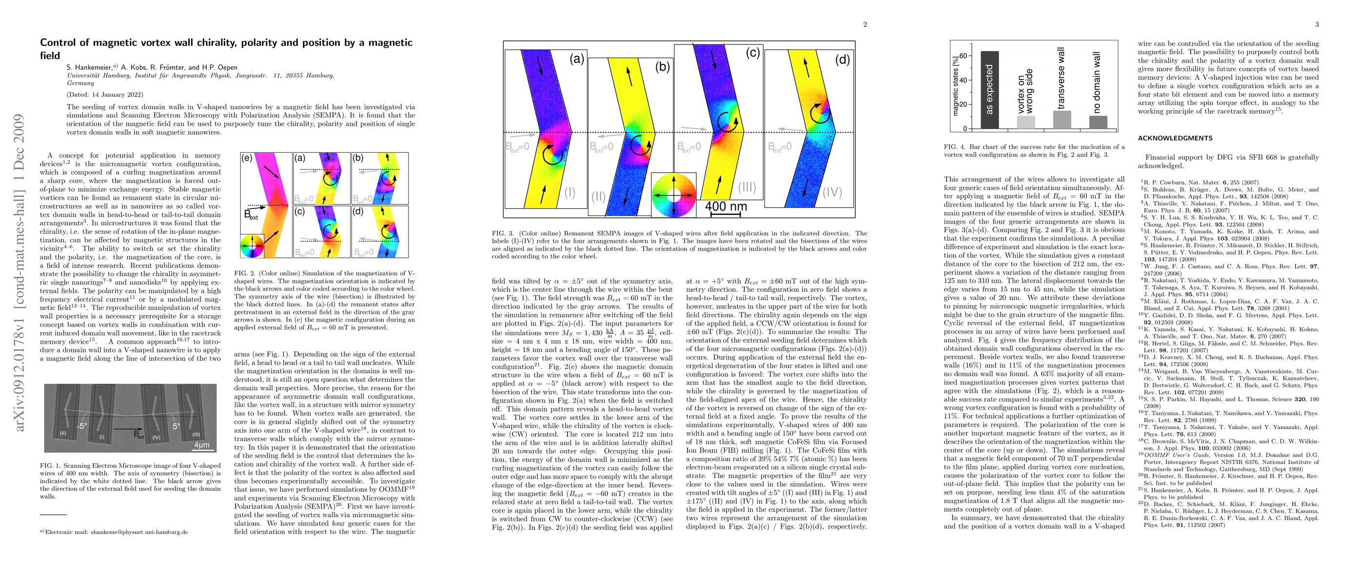 Summary: Simulations and SEMPA reveal that the orientation of an applied magnetic field can precisely control the chirality, polarity, and position of vortex domain walls in V-shaped nanowires, offering a method for manipulating magnetic properties at the nanoscale.