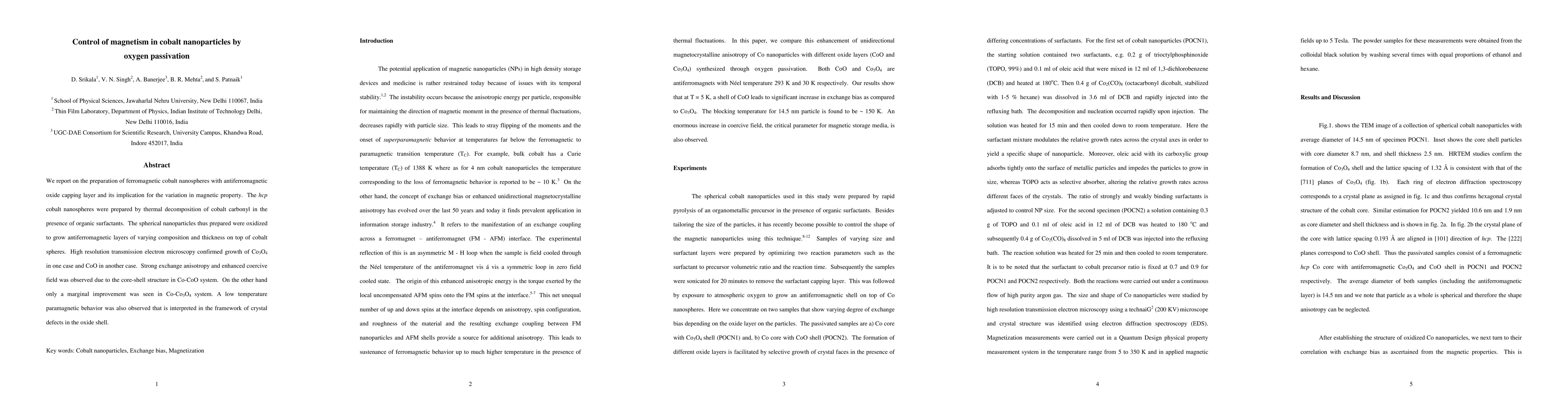 This study investigates the magnetic properties of cobalt nanoparticles passivated with antiferromagnetic oxide layers, showing that a Co-CoO core-shell structure enhances coercive field and exchange anisotropy, while Co-Co3O4 exhibits only marginal improvements, attributed to crystal defects in the oxide shell.